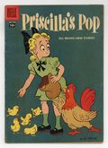 Indicia title is "PRISCILLA'S POP, No. 799." Code number is PRIS.P.O.S. #799-575. Copyright 1957 by NEA Service, Inc. Based on the NEA newspaper strip "Priscilla's Pop" by Al Vermeer. Bored of Education; Superintendent Pennleigh decides to appoint a student as school superintendent for a day; Priscilla gets the honor and does the duties in an unorthodox way. Driving Pop Wild; Priscilla's father "borrows" his neighbor's car when he thinks Priscilla has taken his car for a drive. A Good Bet on the TV Set; When the TV set needs repairs, Priscilla goes to a auto repair shop and borrows some tools. A Hungry Audience; Priscilla's mother sends her brother Carlyle to the theater to bring her home for dinner. 36 pages, full color. Cover price $0.10.