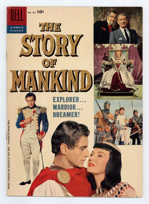 $15.50"The Story of Mankind" - Written by Gaylord Du Bois. Art by Bob Jenney. Photo Cover shows Napoleon (Dennis Hopper), Marc Antony (Helmut Dantine), Cleopatra (Virginia Mayo), Old Scratch [The Devil] (Vincent Price), The Spirit of Man (Ronald Colman), Queen Elizabeth I (Agnes Moorehead) and Joan of Arc (Hedy Lamarr). Explorer...warrior...dreamer -- a brief history of mankind! Not an adaptation of the movie -- based in part on the 1921 novel The Story of Mankind by Hendrik Willem Van Loon. 36 pages, full color. Cover price $0.10.