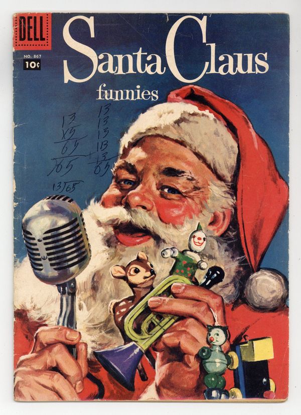 Indicia title is "SANTA CLAUS FUNNIES, No. 867." Painted cover art. Christmas Eve poem, art by Mel Crawford. Santa's Suit, art by Mel Crawford; Santa's red suit blows off the clothesline where Mrs. Claus put it to air out before Santa's big Christmas trip; The suit blows to the door of Pete Polar Bear who assumes it's a Christmas present for him. Stocking word scramble. Santa's Helper, art by Dan Gormley; Santa enlists Kenny to help him when his address book gets wet in a blizzard and the ink runs. Christmas in Many Lands article. Sooky's First Christmas, art by Dan Gormley; Sooky the pup slips out the front door of his house and gets caught in a snowstorm on Christmas eve. Christmas Tree Connect-the-Dots puzzle. A Christmas Present for Betsy Mouse, art by Don Gunn. 36 pages, full color. Cover price $0.10.
