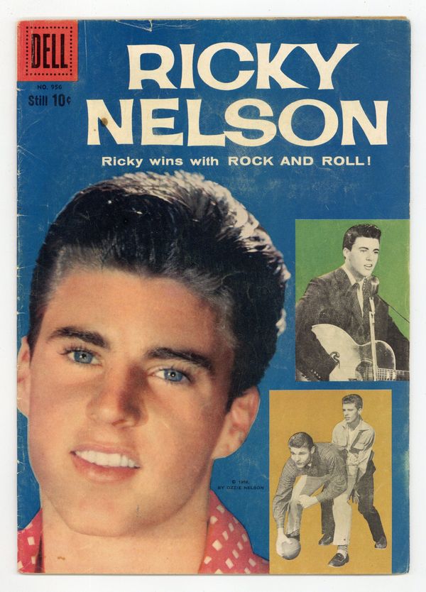 $16.50Indicia title is "RICKY NELSON, No. 956." Photo cover of Ricky Nelson and David Nelson. Short article on Ricky Nelson and his family, with photos. Rock and Roll Knockout; A fortune-teller tells Ricky he will meet a redhead who will change his life; He meets the girl, Carlene, who is his friend Carl's cousin. Playboy Masquerade; Ricky is working as an attendant at a gas station; A rich girl hires Ricky to pretend to be a French playboy and date her, so that she can get her father to bribe her with a car to dump him. Photos of Ricky and his family in various activities. "Autographed" black and white head and shoulders photo of Ricky Nelson on back cover. 36 pages, full color. Cover price $0.10.