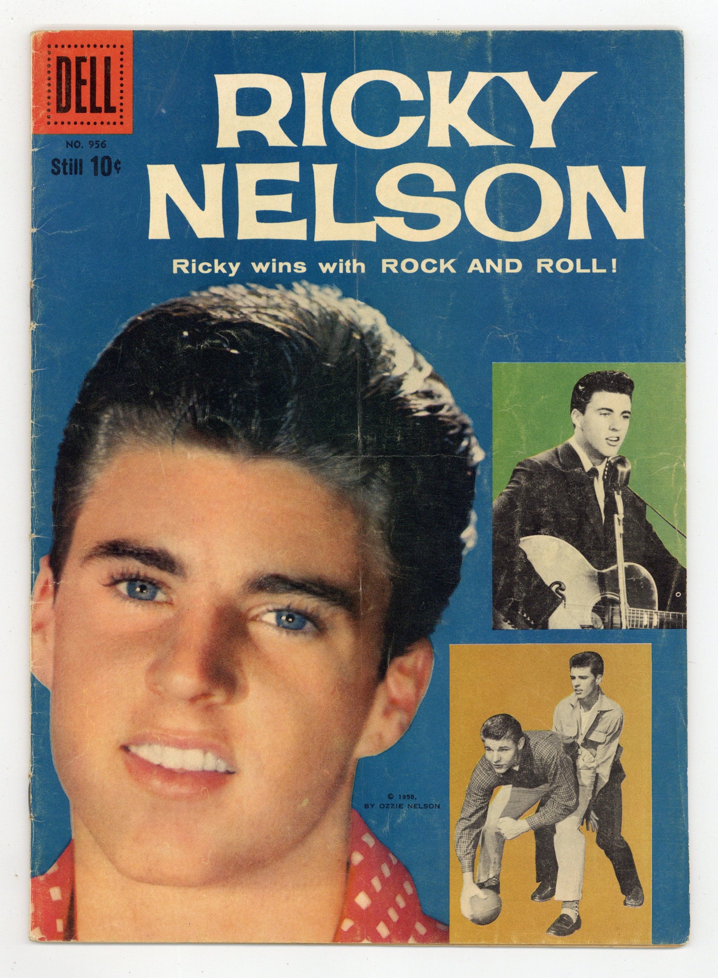 Indicia title is "RICKY NELSON, No. 956." Photo cover of Ricky Nelson and David Nelson. Short article on Ricky Nelson and his family, with photos. Rock and Roll Knockout; A fortune-teller tells Ricky he will meet a redhead who will change his life; He meets the girl, Carlene, who is his friend Carl's cousin. Playboy Masquerade; Ricky is working as an attendant at a gas station; A rich girl hires Ricky to pretend to be a French playboy and date her, so that she can get her father to bribe her with a car to dump him. Photos of Ricky and his family in various activities. "Autographed" black and white head and shoulders photo of Ricky Nelson on back cover. 36 pages, full color. Cover price $0.10.