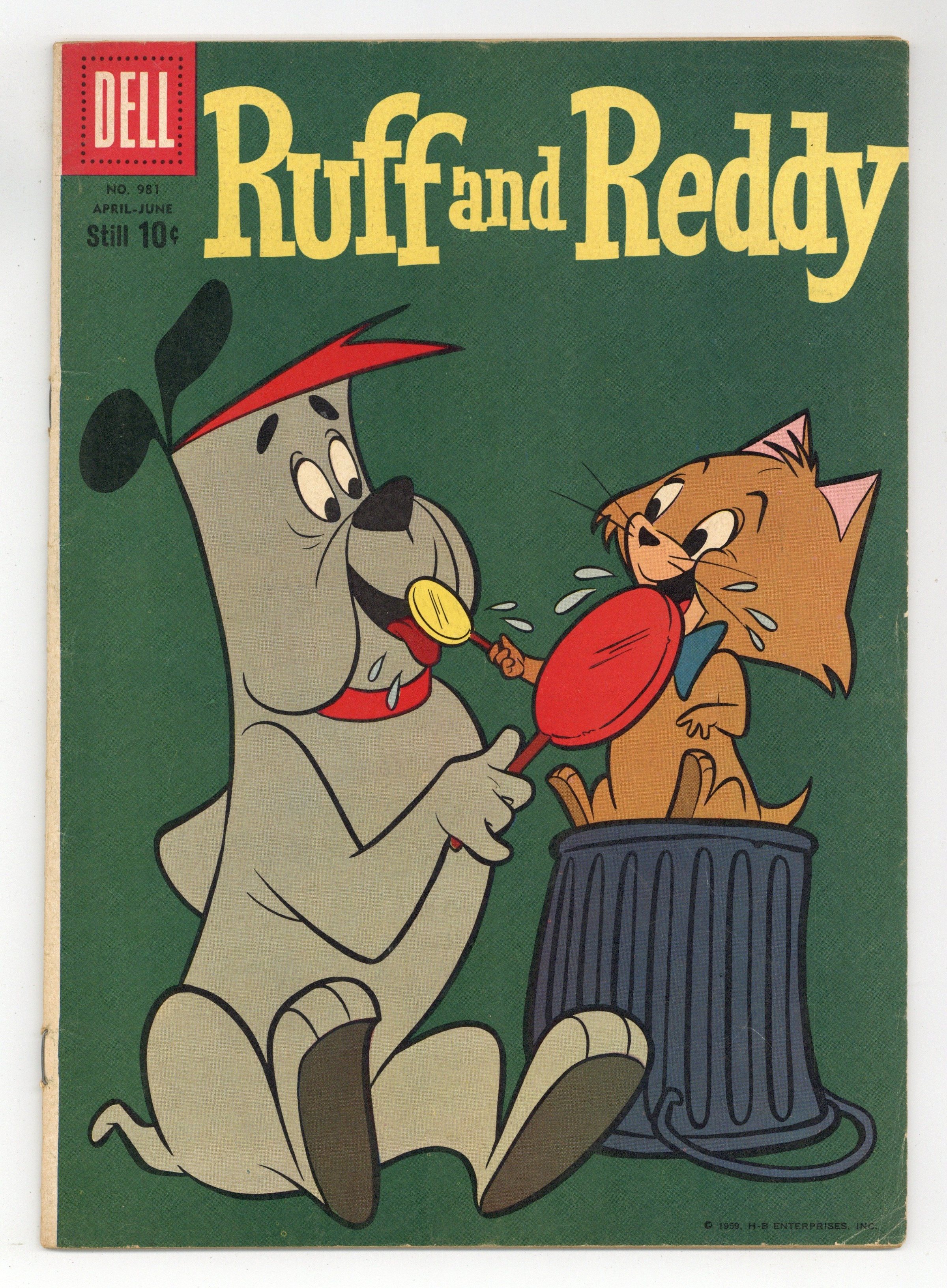 $18.50Indicia title is "RUFF AND REDDY, No. 981." Based on the "Ruff and Reddy" animated TV series. Ruff and Reddy and the Teeny Genie; Ruff and Reddy are in the desert of Arvania following a map which is supposed to lead them to the lost city of Bagdaddy-O. Horsin' Around; Ruff and Reddy try to find a way for an old circus horse to become a performer again. The Hectic Hobby; Ruff takes up a new hobby--hypnotism. The Doggie Deputy; Ruff and Reddy's car breaks down in a western town. All art by Harvey Eisenberg. 36 pages, full color. Cover price $0.10.