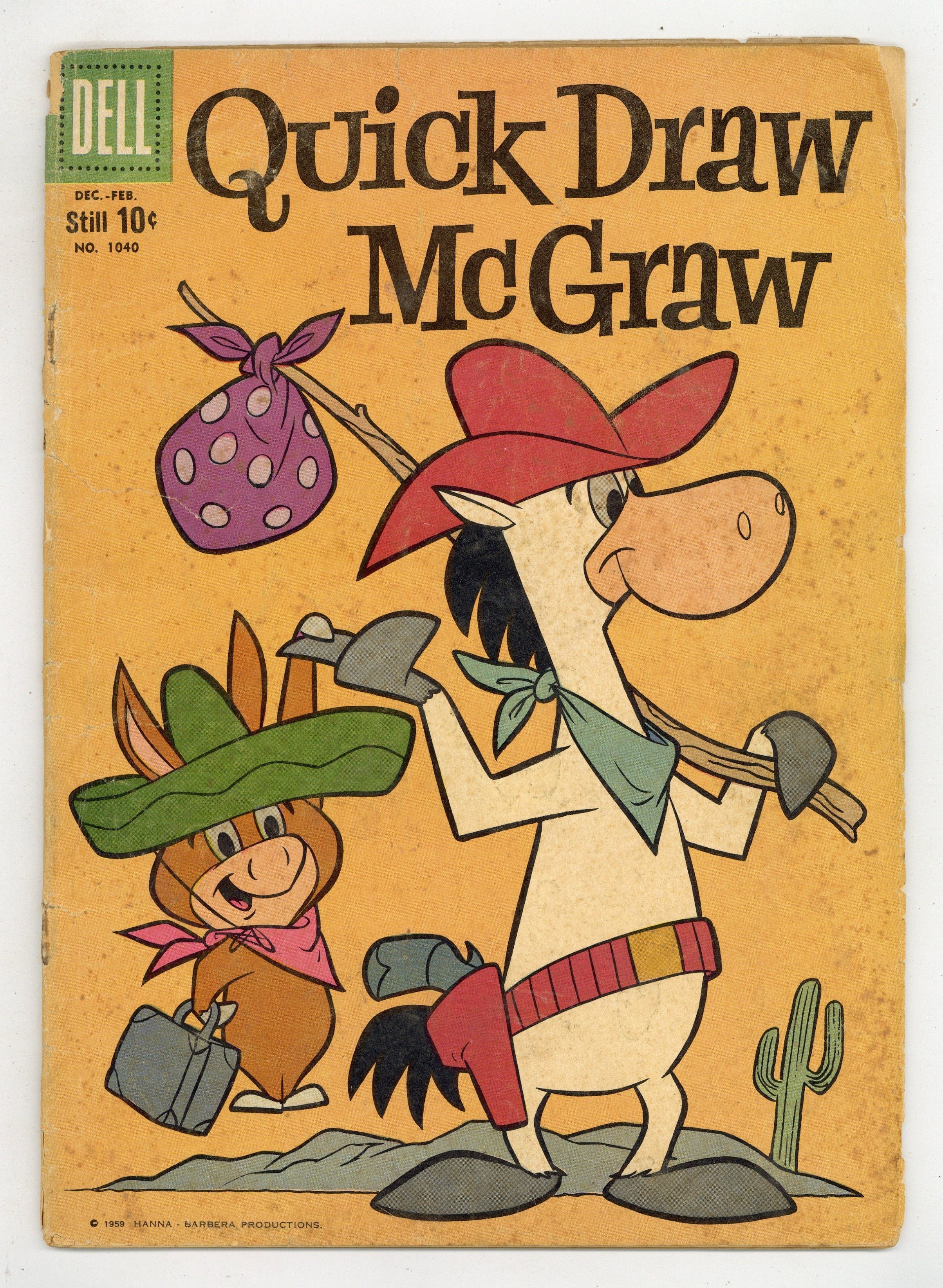 Indicia title is "QUICK DRAW McGRAW, No. 1040." Cover art by Harvey Eisenberg. Traveling Trouble Shooter; Quick Draw and Baba Looey have to catch the badmen causing trouble in Dodge City, Doomstone, and Sundown. Missing House Mystery; Snooper and Blabber follow the trail of a house that was stolen because of its wall murals by the famous artist Len Arty. Just Plain Doggie; Augie is embarrassed to be a "just plain doggie" so Doggie Daddy sends away to have the family tree traced. The Magnificent Massacre; Quick Draw is a scout for a wagon train, but the Indians think he's a Hollywood talent scout for the movies. Art by Harvey Eisenberg. Illustrated ad promoting free rental of a sound color film about rocket experimenting, produced by the Daisy Manufacturing Company in cooperation with the United State Air Force. 36 pages, full color. Cover price $0.10.