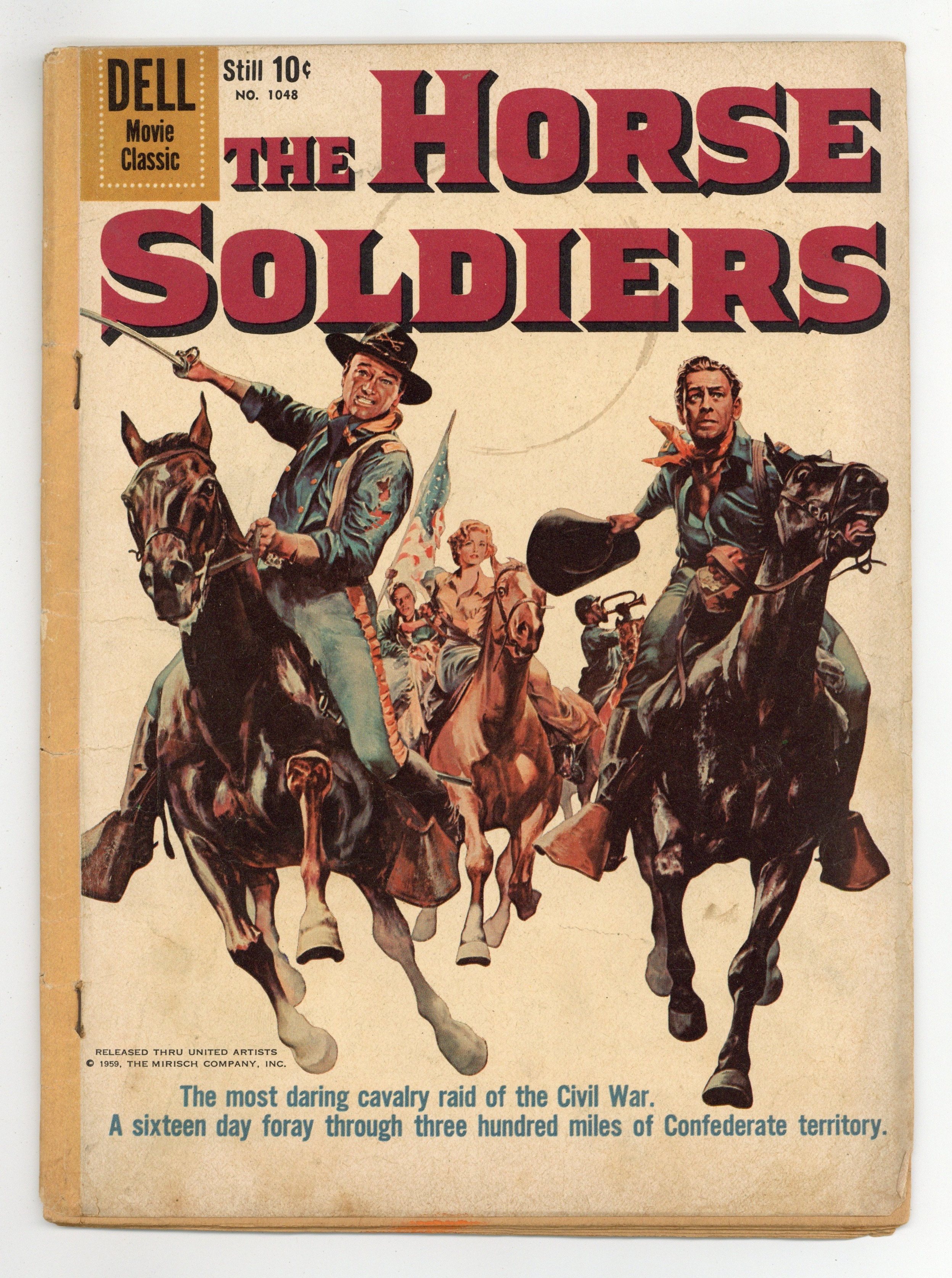Indicia title is "THE HORSE SOLDIERS, No. 1048." Adapted from the 1959 movie "The Horse Soldiers." Painted cover art. Preview with photos. The Horse Soldiers, script by Gaylord Du Bois, pencils by Mike Sekowsky, inks by Mike Peppe; Col. Marlowe and his Union calvary strike deep into Confederate territory and after a pitched battle at Newton Station, continue to fight their way to the Union forces at Baton Rogue. Short article on the Confederate use of gabions, a forerunner of the modern foxhole. Facts about filming one scene from the movie. 36 pages, full color. Cover price $0.10.