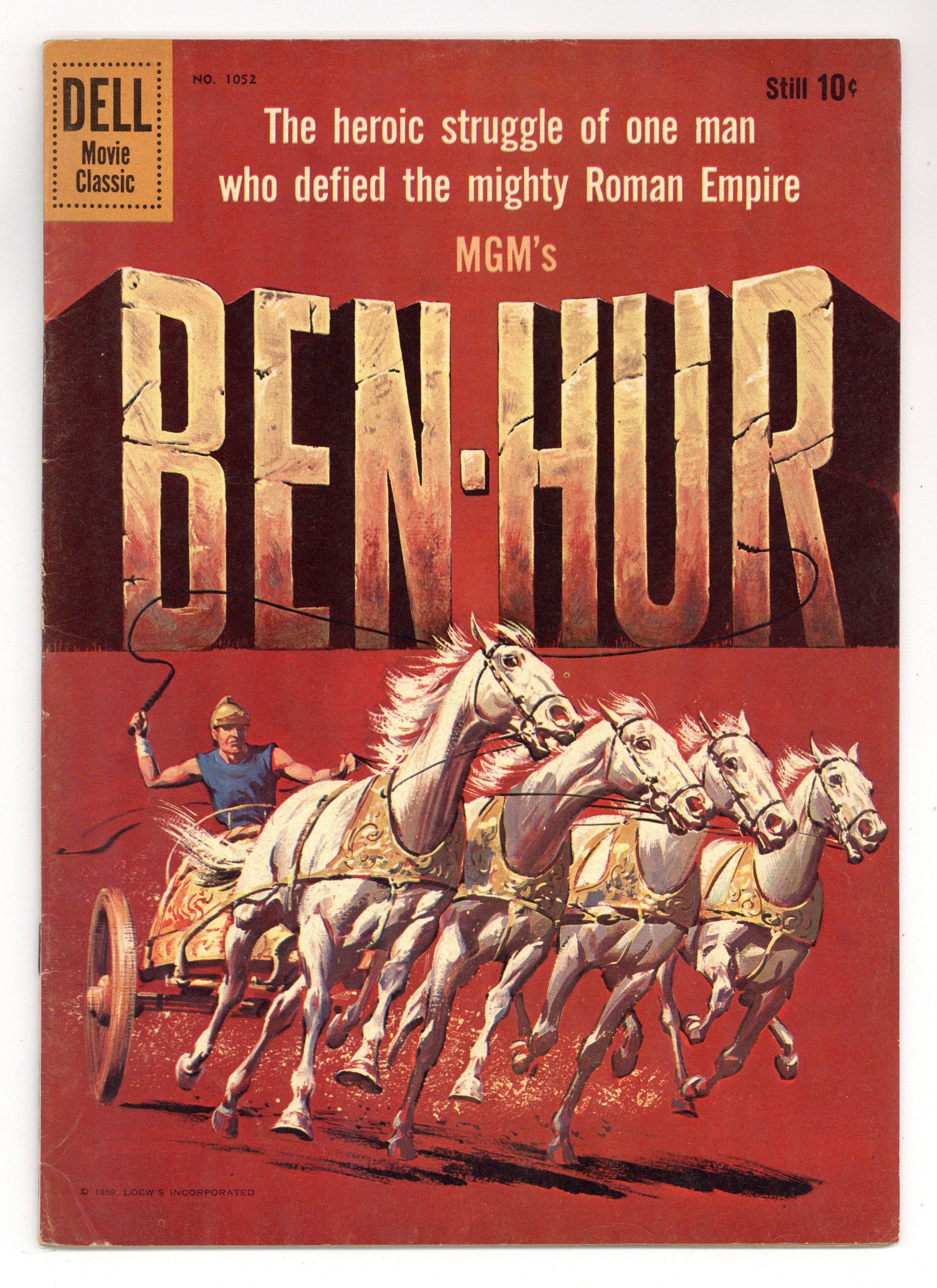 $17.00Indicia title is "Ben Hur, No. 1052. Adapted from the 1959 movie "Ben-Hur." Painted cover art by Sam Savitt. Ben-Hur, script by Lew Wallace (original story), and Eric Freiwald and Robert Schaefer (comic adaptation), art by Russ Manning; Messala returns to Jerusalem to become commander of the Roman Legion there. He meets a childhood friend, Prince Judah Ben-Hur, who is the richest man in the city; Massala asks him to put down a possible rebellion by the Jews. Ben-Hur refuses and is sentenced to be a galley slave; After three years on the galleys, he saves the life of Commander Quintus Arrius during a sea battle and is given his freedom, though not allowed to return to Judea. He becomes an expert chariot racer and is rewarded by being named Arrius' heir. Facts about Ben-Hur the movie with photos. 36 pages, full color. Cover price $0.10.