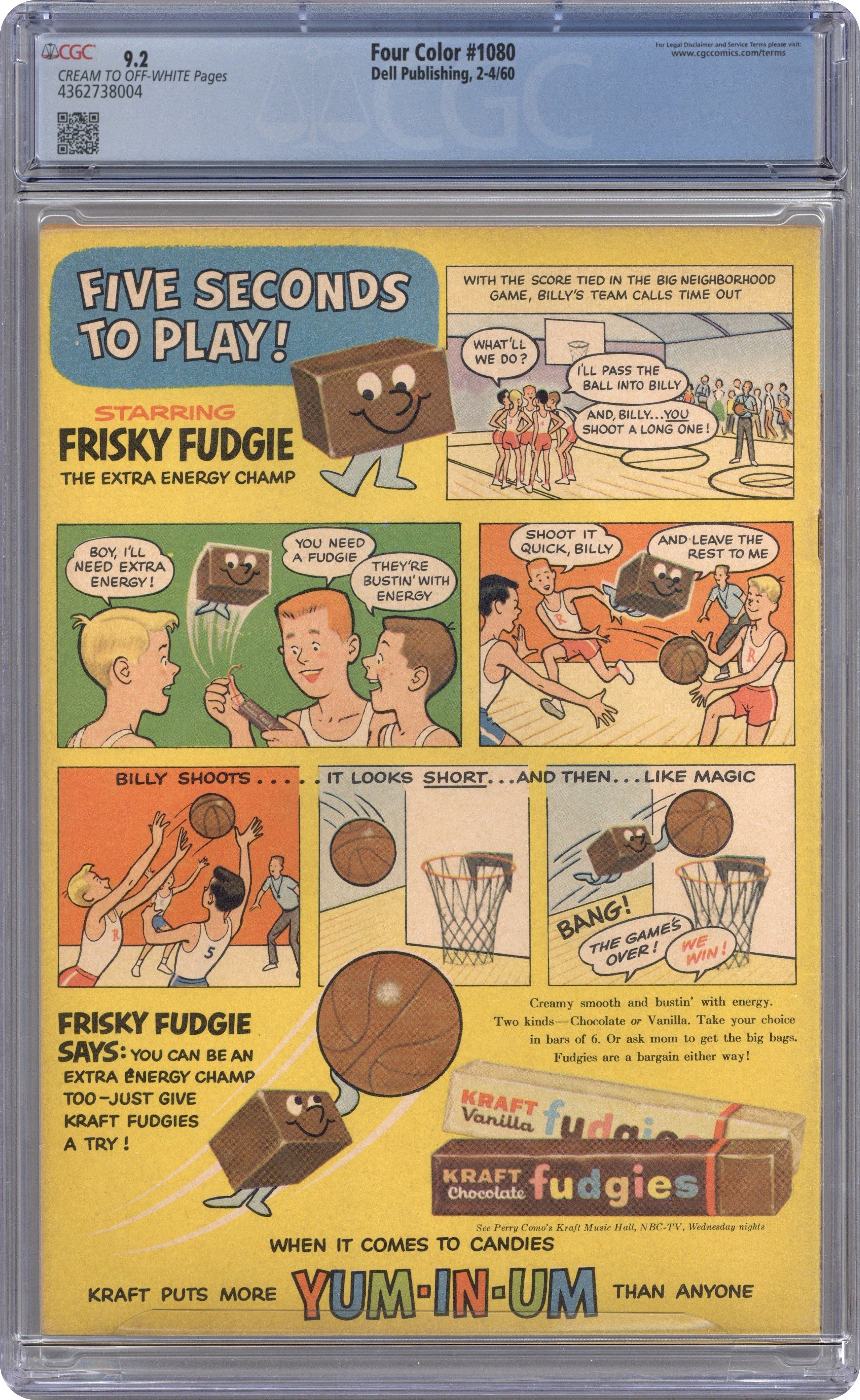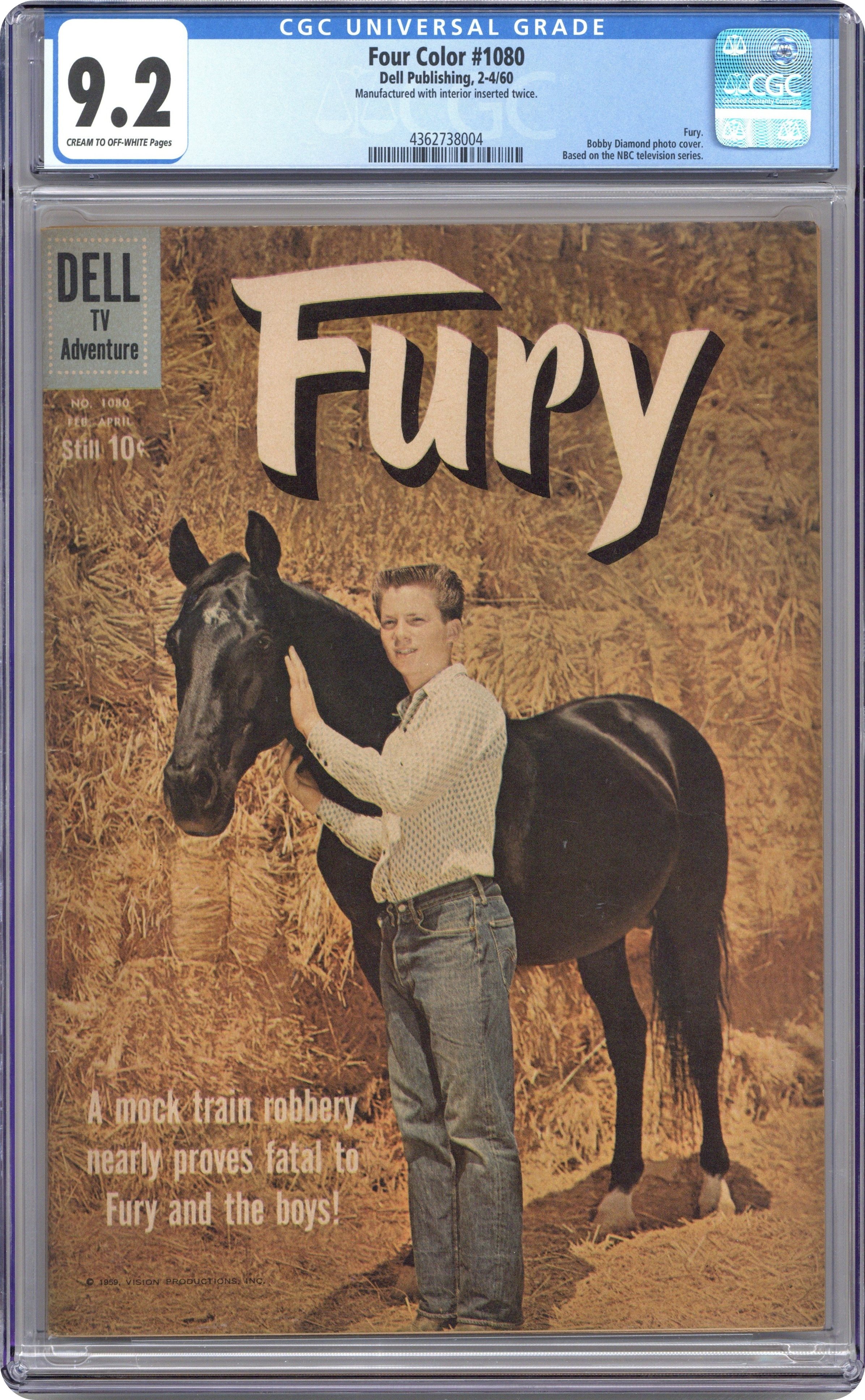 Ad back cover. Indicia title is "FURY, No. 1080." Based on the 1955-59 "Fury" syndicated TV series. Photo cover of Fury (as played by Highland Dale) and Joey Newton (as played by Bobby Diamond). Preview with photos. The Train Robbery; Two bandits take advantage of a re-enactment of an old-time train robbery to rob a modern train nearby; They escape on the old steam train then transfer to a jeep. Joey and Packy are following on their horses but get captured when the crooks' jeep gets stuck. The Bounty Hunter; Joey and Packy find a bounty hunter using a cave on the Broken Wheel ranch as a base for his wolf hunts; Aside from trespassing, the hunter is cruelly using a fawn as bait for the wolves. Facts about train robberies in the old West. All art by Tom Gill. 36 pages, full color. Cover price $0.10.