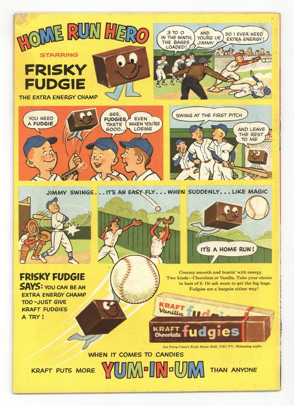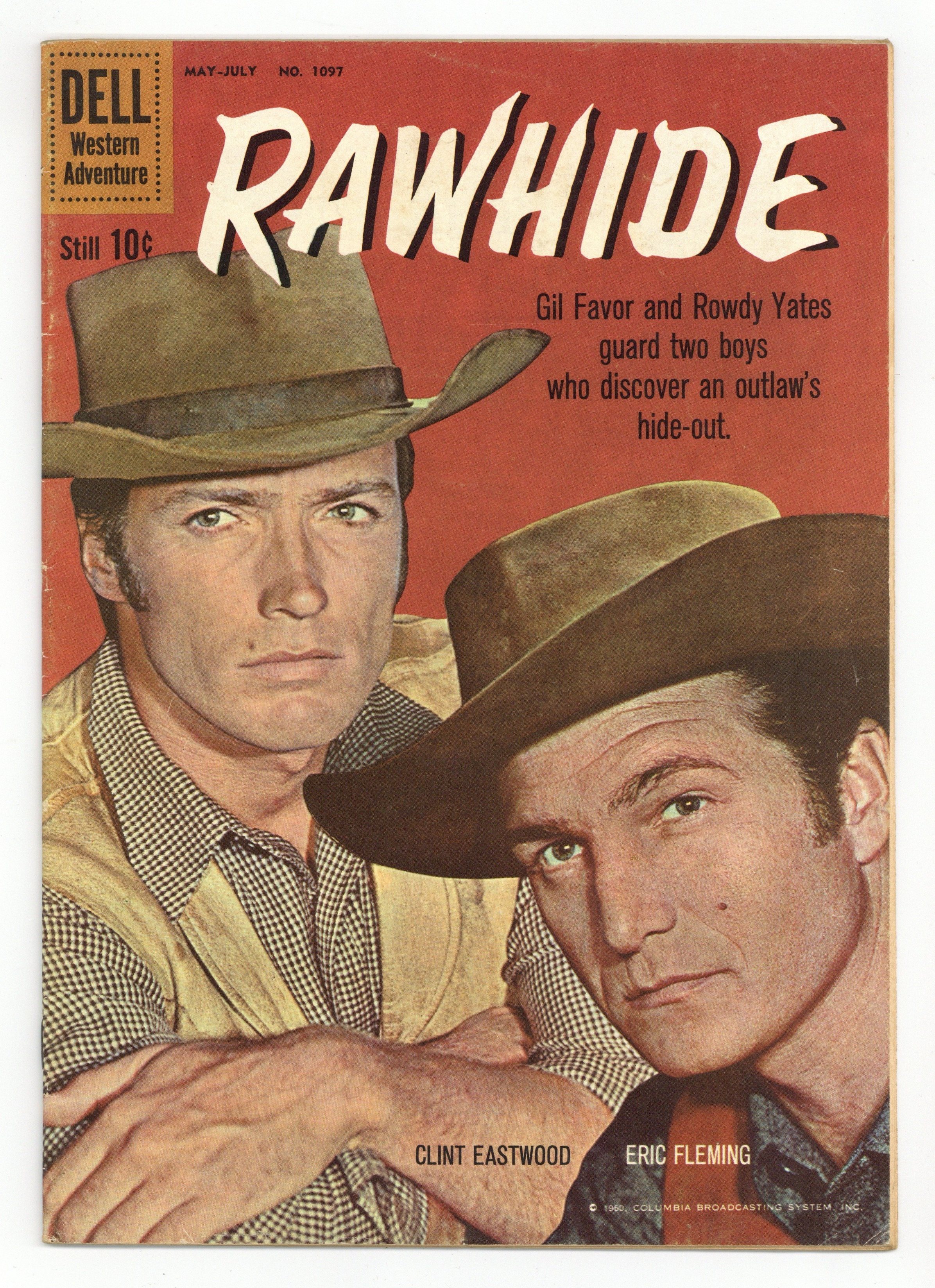 Version with ad on back cover. Indicia title is "RAWHIDE, No. 1097." Based on the CBS TV series "Rawhide." Cover photo of Gil Favor (as played by Eric Fleming) and Rowdy Yates (as played by Clint Eastwood). The Outlaw Trail, script by Eric Freiwald and Robert Schaefer, art by Russ Manning; Two young boys try to join the trail herd after they stumble across the hideout of Cram Kincaid and his outlaw gang. Wishbone's Luck, script by Eric Freiwald and Robert Schaefer, art by Russ Manning; After taking the chuck wagon to get supplies for the trail crew, Wishbone is stopped by two outlaws who take him and the supplies to their hideout. Sure Crossing, art by Russ Manning; facts about Col. Andy Snyder of the Confederate Army, a trail boss who invented a novel method of getting cattle herds to cross rivers. Kraft Fudgies ad. 36 pages, full color. Cover price $0.10.