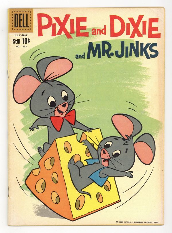 $18.00Ad back cover. Pixie and Dixie and Mr. Jinks. Stories by unknown. Art and Cover by Harvey Eisenberg. Featuring the tales "It Takes Two to Teeter," "Snacktime," "Picnic Pirates" and "Hoodoo House," plus the 1-page stories "Door Dilemma," "Hello-Good-bye," "Rough Rider" and "The Kickback"! 36 pages, full color. Cover price $0.10.