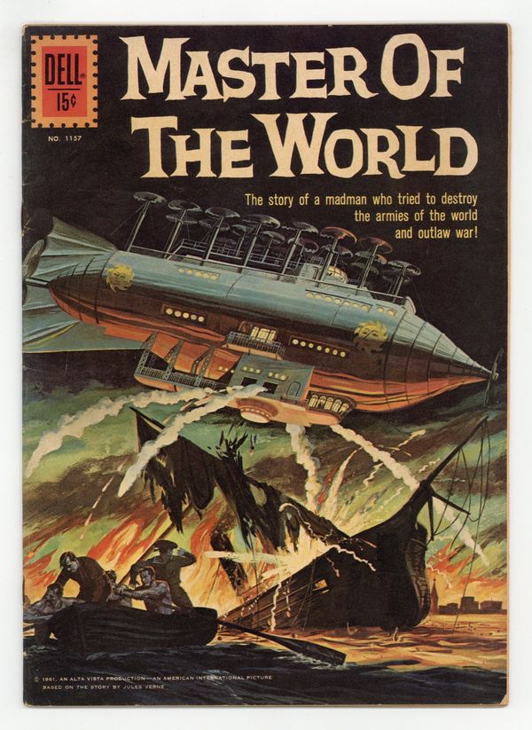 $16.50Indicia title is "MASTER OF THE WORLD, No. 1157." Adapted from the 1961 movie "Master of the World." Painted cover art. Master Of The World, script by Jules Verne (original stories) and Gaylord Du Bois (comic adaptation), art by Jack Sparling; In 1871, three balloonists are captured when they investigate the eruption of a volcano in Pennsylvania; Their captor is the mad inventor Robur, who has built a huge airship. He embarks on a mission to attack the world's armies and force them to give up war. Jules Verne, Author Extraordinary bio, script by Gaylord Du Bois, art by Jack Sparling. 36 pages, full color. Cover price $0.15.