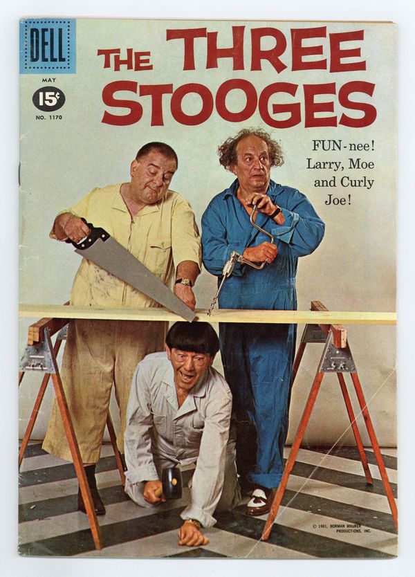 $14.00Indicia title is 'THE THREE STOOGES, No. 1170." Photo cover of The Three Stooges (Moe Howard, Larry Fine, and Curly Joe DeRita). Boobs in the Woods; The Stooges go to Red Rock National Park, where they cause chaos for the forest rangers. Midway Madness; Curly Joe becomes a lion tamer in a circus. Unspecial Delivery; Criminals posing as scientists pay the Stooges to deliver a package to Senator Carmichael. Something Fishy; Curly Joe is studying to be a magician. All art by Sparky Moore. Three Stooges Magic Foto Club/Three Stooges Fan Club ad. 36 pages, full color. Cover price $0.15.