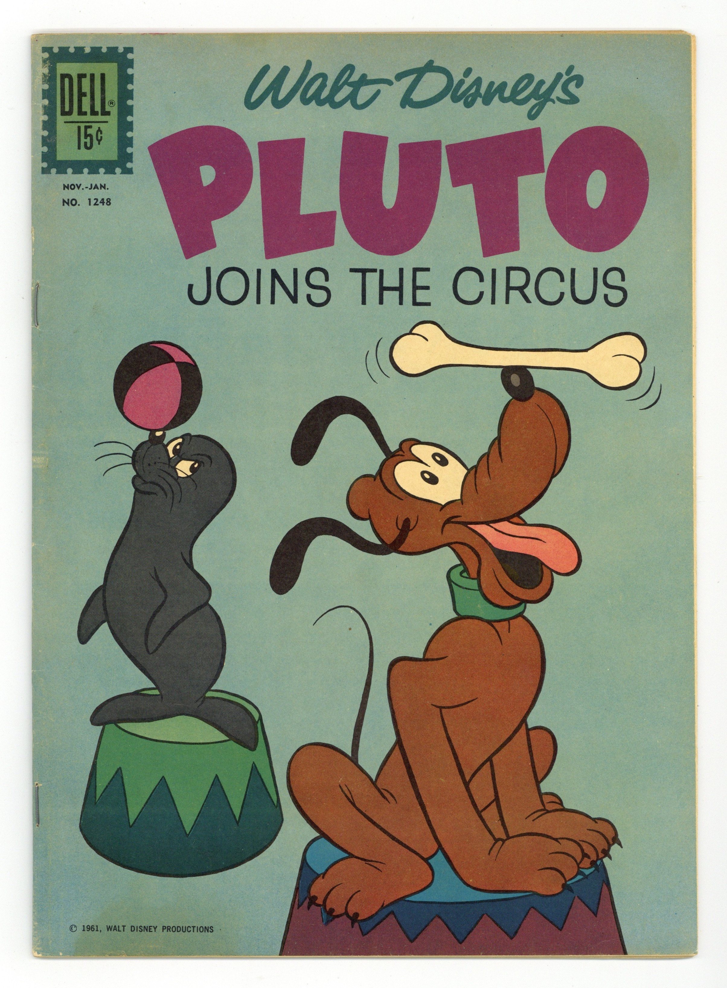 Walt Disney's Pluto Joins the Circus. Stories by Don R. Christensen. Art and Cover by Paul Murry. Featuring the tales "Pluto Joins the Circus," "Monster at Large," "Stars in His Eyes," "Sudden Fame" and "Windblown Bombshell," plus the 1-page stories "Sealed Up," "Hoop Happy," "Big Game Guy" and "The Hiding Place"! Starring Pluto, Mickey Mouse, Morty and Ferdie, Dumbo, Timothy Mouse and Horace Horsecollar! 36 pages, full color. Cover price $0.15.