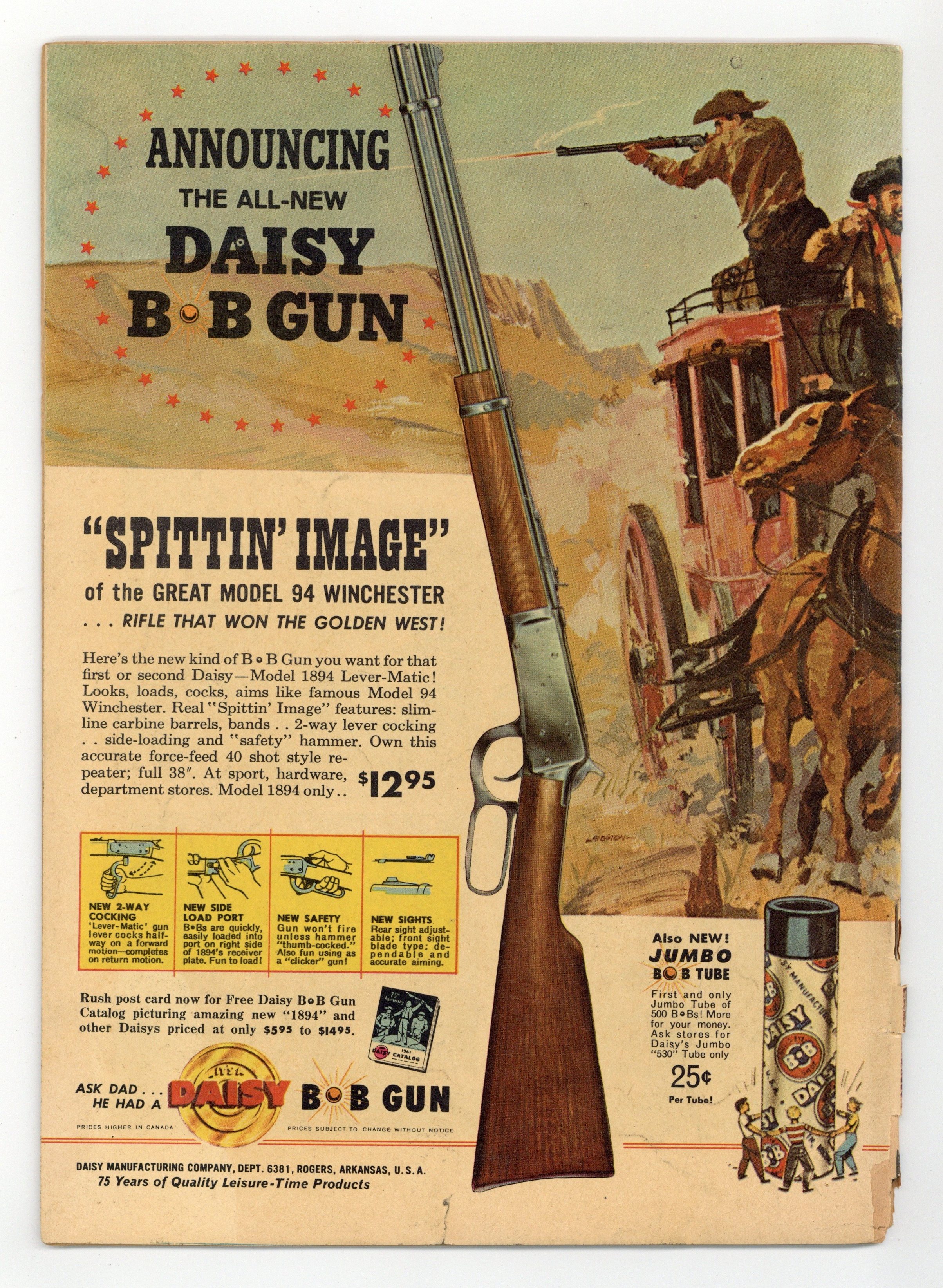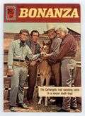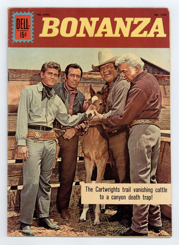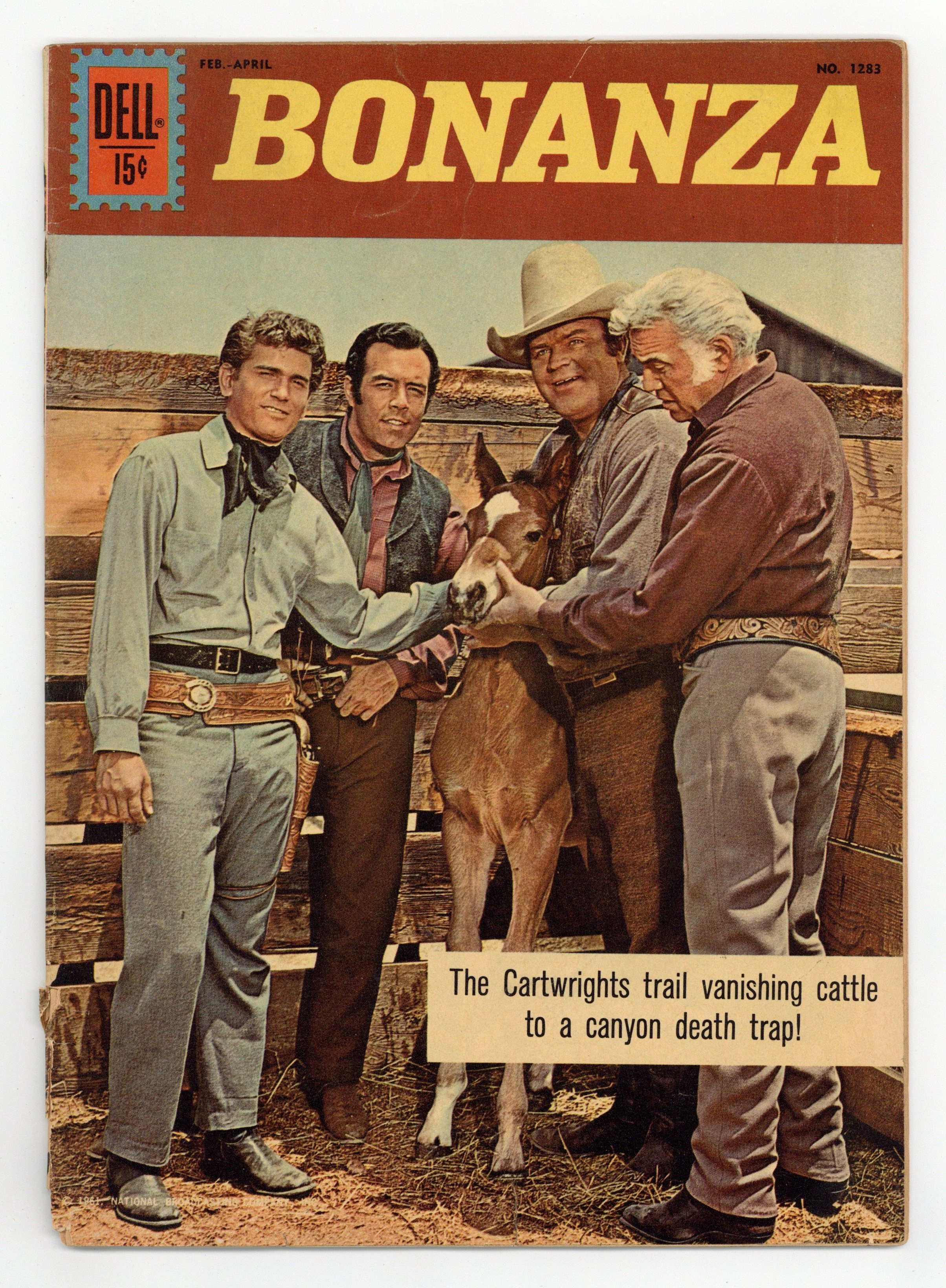 Indicia title is "BONANZA, No. 1283." Photo cover of Ben Cartwright (as played by Lorne Greene), Little Joe Cartwright (Michael Landon), Hoss Cartwright (Dan Blocker), and Adam Cartwright (Pernell Roberts). Preview with photos. The Four-Flusher; Gambler "Lucky Lou" Montaine captures the Cartwrights and tries to makes Ben sign a deed turning the Ponderosa over to him. One Dark Night; The Cartwrights trail vanishing cattle to a canyon death trap. Swimming Cattle fact page; The dangers of cattle swimming across rivers in cattle drives. Scripts by Gaylord Du Bois, art by Tom Gill. 36 pages, full color. Cover price $0.15.