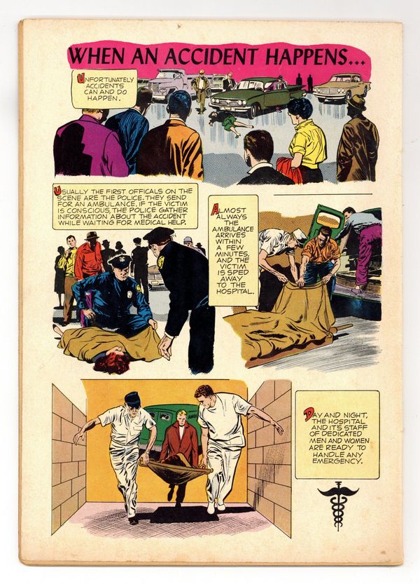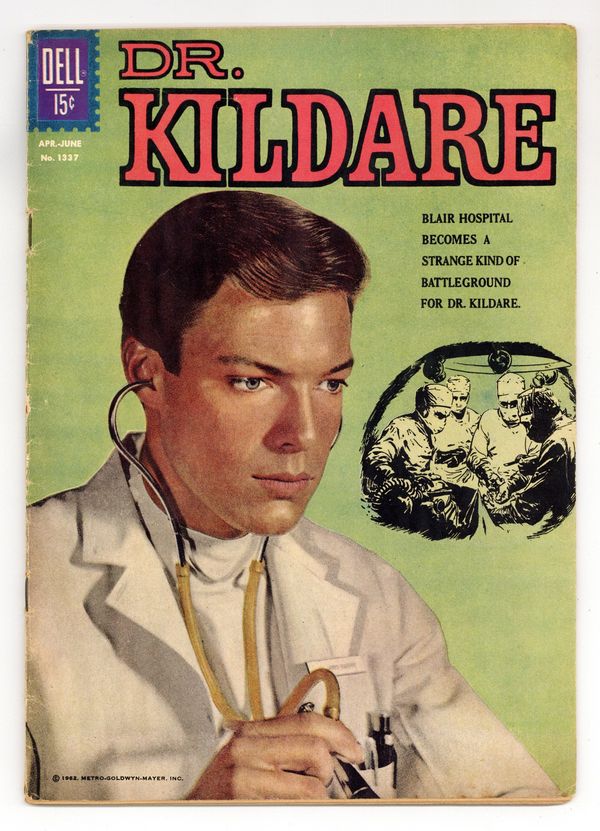 Indicia title is "DR. KILDARE, No. 1337." Based on the "Dr. Kildare" TV series. Photo cover of Dr. James Kildare (as played by Richard Chamberlain). The Doctor, art by Doug Wildey; Brief summary of the process of becoming a medical doctor. The Doctor and the Gambler, art by Doug Wildey; Gambler Eddie Eastman checks into the hospital to hide out from some enemies for a few days; After finding there is nothing wrong with him, Dr. Kildare wants him to leave; but Eastman threatens to have his men harm Dr. Gillespie unless he is allowed to stay. Some basic first aid instruction. Brief summary of the procedures following an accident between a car and pedestrian. 36 pages, full color. Cover price $0.15.