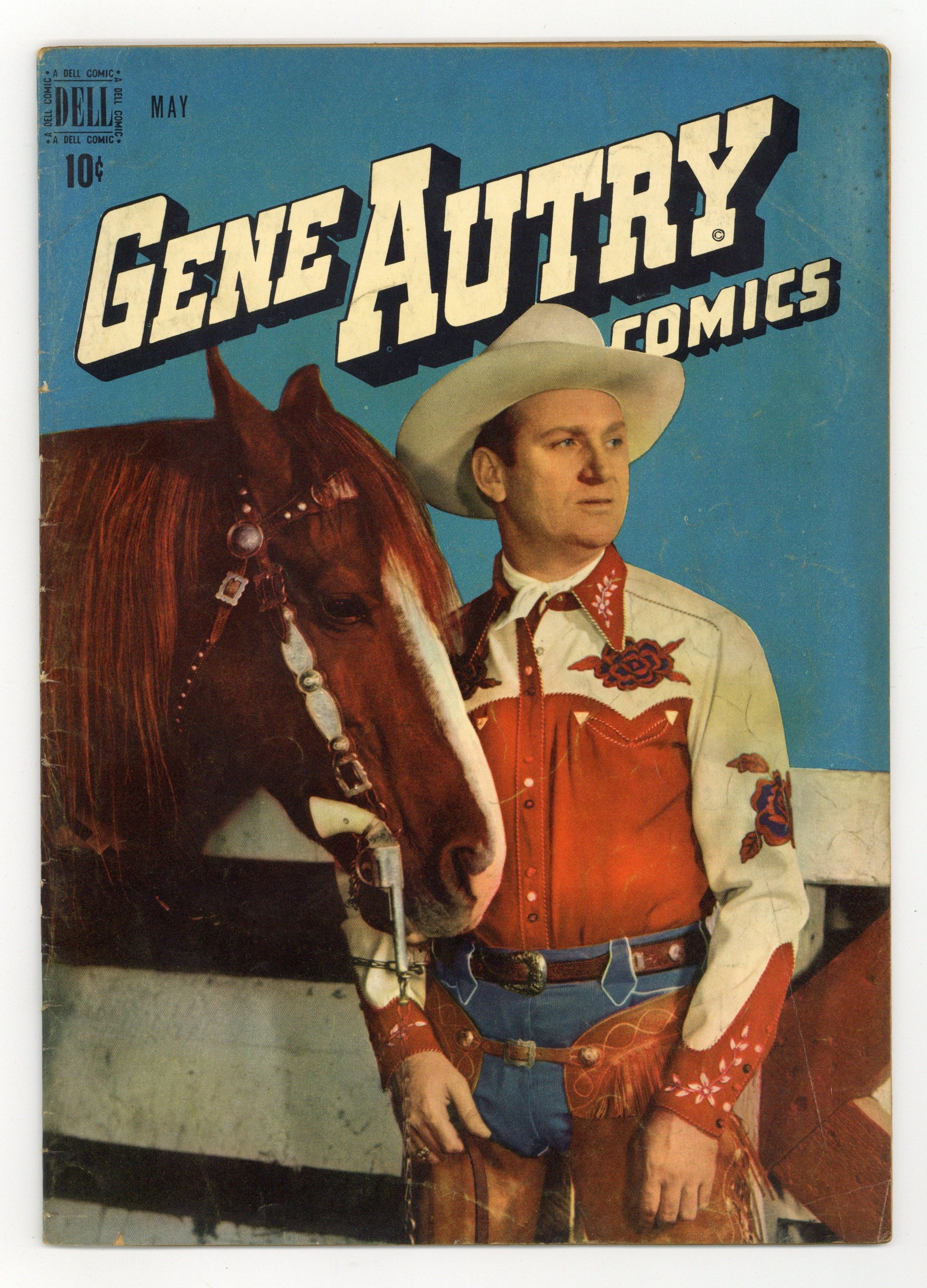 Photo cover of Gene Autry. Stories and art by Elizabeth Beecher and others. Singing cowboy Gene Autry was a multimedia star from the 1930s-1950s, in music, movies, radio, and television, as well as comic books. Telltale $100 bills point Gene to the identity of the masked bandit who robbed a mail shipment. But after the owlhoots get the drop on him, he's aided by Bill Hendryx, who has a talking raven and a trained bear. Panhandle Pete tells the story of Liseta's gold. Wild Horse Ranch; Jest Plain Luck; Nuggets in the Desert. 32 pages, Full Color. Cover price $0.10.