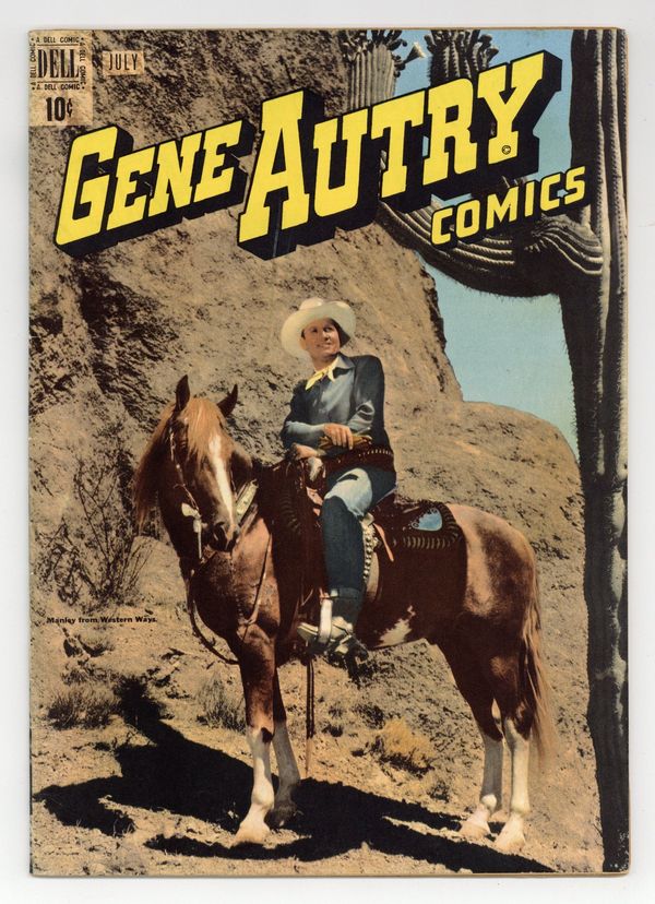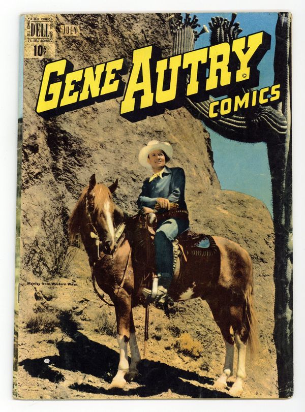 Comic book featuring the famous singing cowboy hero Gene Autry. Gene Autry and Champion photo cover. "Gene Autry and the Clue of the Wolf," script by Gaylord Du Bois, pencils by Nicholas Firfires; Gene rescues a runaway stage, lays a trap for a highwayman, the tame wolf identifies the mystery culprit, the prospector's daughter who was heading to enroll for schooling gets engaged to her uncle's step-son, owner of the wolf. "A Long Memory" text story. Untitled story, script by Gaylord Du Bois; Wild horses lure away the purebred Arab mares and colts, including the finest colt, White Cloud aka Whitey, in Champ's master's care. Champ pursues, engaging the wild pinto leader in a death match interrupted by a cougar who has downed Whitey; Champ repels the cougar as the herd stampedes at its scent. Champ's master rides back for the wagon as Champ guards Whitey. Gene Autry photo on inside back cover and on back cover. 36 pages, full color. Cover price $0.10.