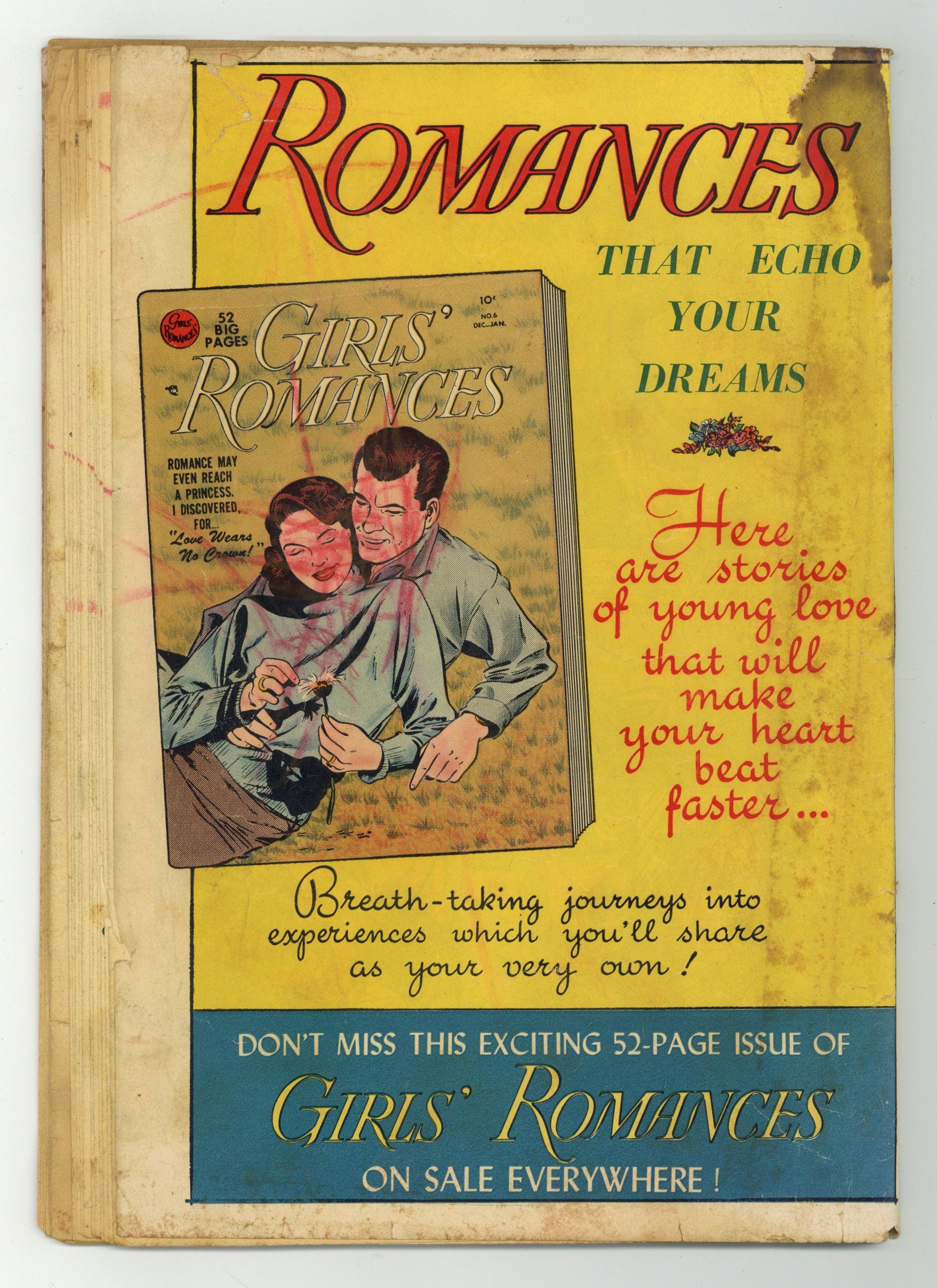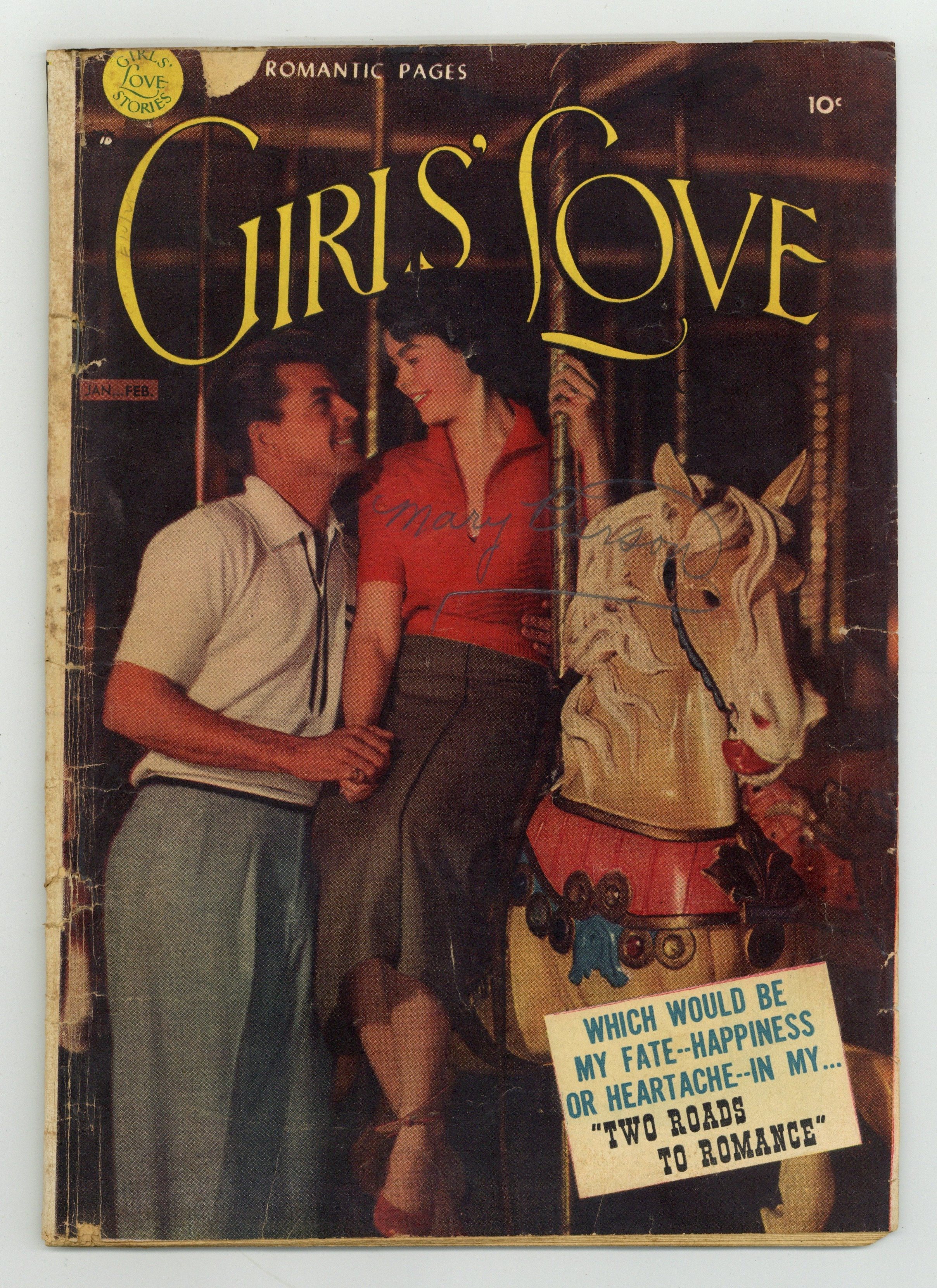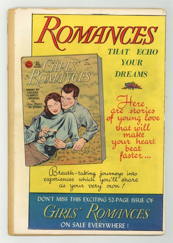 $120.00Which would be her fate -- happiness or heartache -- in her..."Two Roads to Romance," the cover-featured 10 page story. Plus: 1 page Binny cartoon; 8 page story "Yesterday's Kisses"; 1 page Johnny and Jane cartoon; 8 page story "Sweethearts' Moon"; 1 page Joan cartoon; 7 page story "Taken for Granted"; 2 page Romance Quiz; 1 page Busy Belles profile; 8 page story "A Friend of the Groom"; 1 page Carol cartoon; 1 page A Birthday written by Christina Rossetti. Cover price $0.10.