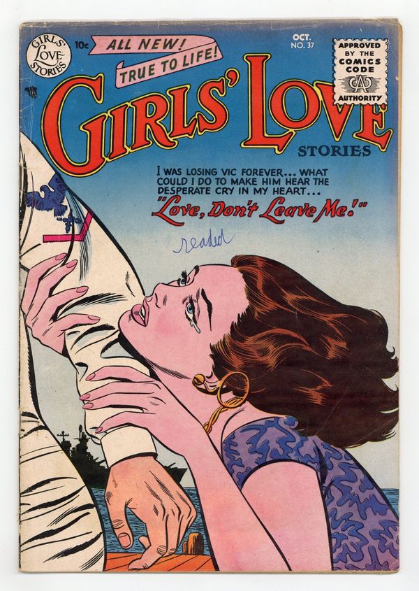 She was losing Vic forever -- what could she do to make him hear the desperate cry in her heart? "Love, Don't Leave Me!" is the cover-featured 8 page story. Plus: 7 page story "Letter from an Unknown Love"; 7 page story "Brooding Heart"; 2 page text story "What Price Beauty?"; 7 page story "Friend of the Bride." Cover price $0.10.