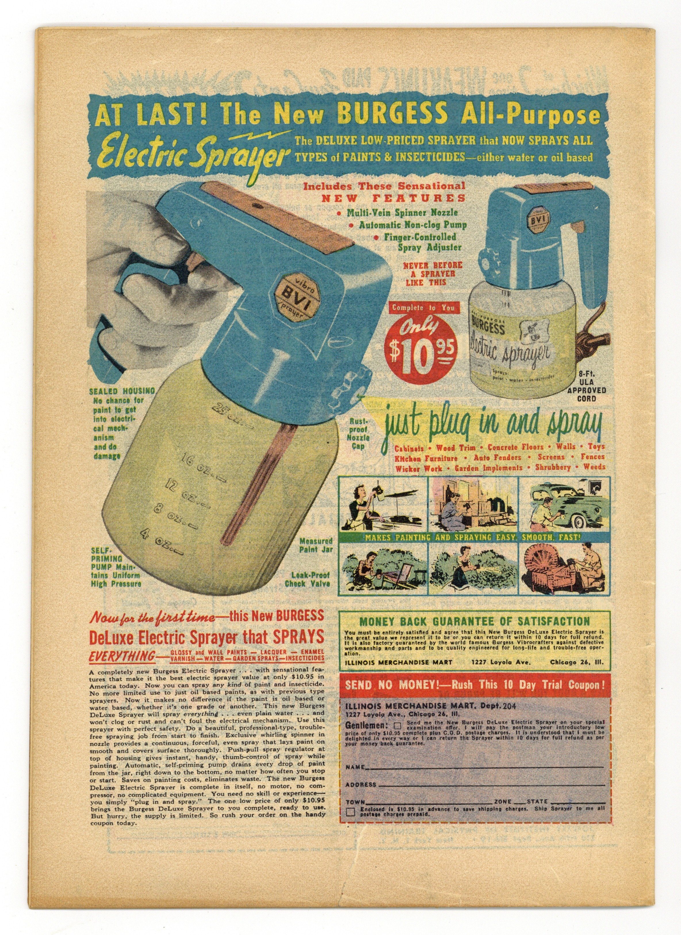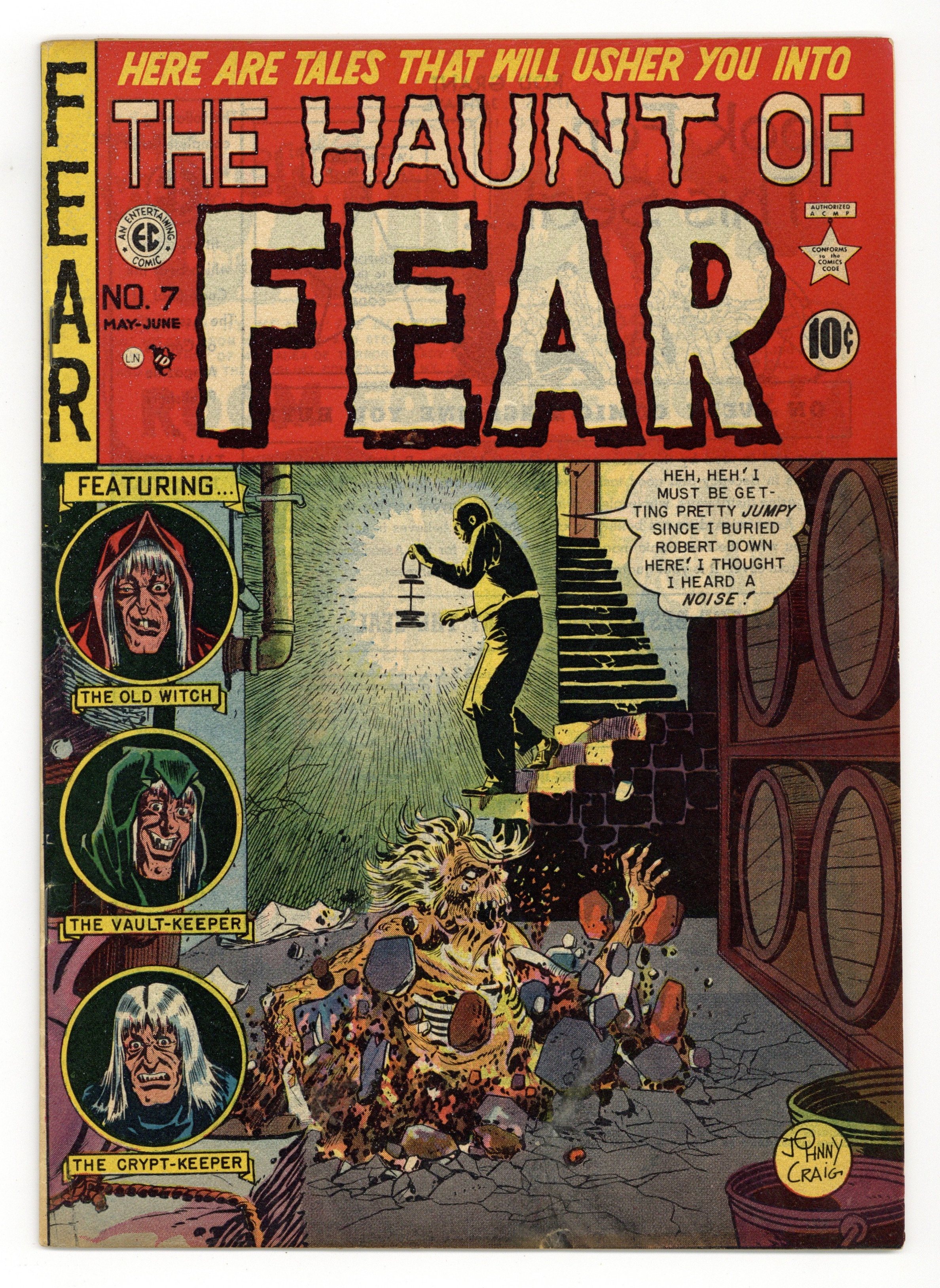Cover art by Johnny Craig. Room For One More!--The Witch's Cauldron!, script by Albert B. Feldstein, art by Graham Ingels; Young Rodney Whitman loses his parents in an automobile accident and goes to live with relatives; When he reaches twenty he realizes there is only one spot left in the family crypt and wishes to secure it for himself, thus he murders his three living relatives and disposes of their bodies in the swamp, lake, and cellar. The Basket!--The Crypt of Terror, script by Albert B. Feldstein, art by Jack Davis; A man born with two heads carries a basket around on his shoulder to prevent others from knowing of his condition. Horror In the School Room--Haunt of Fear, script by Albert B. Feldstein, art by Jack Kamen. The Howling Banshee!--The Vault of Horror!, script and art by Johnny Craig. 36 pgs. $0.10. Cover price $0.10.