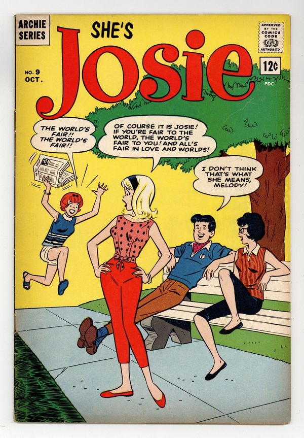 Cover pencils by Dan DeCarlo, inks by Rudy Lapick. You're The Tops (Chapter 1); The gang tries to win a trip to the 1964 New York World's Fair by collecting the most tops from Crispy Crunchy cereal boxes. A Run For Your Money (Chapter 2); Alex takes the gang to the World's Fair in his private helicopter, but he loses his wallet there and everyone spreads out looking for it. Fair Play (Chapter 3); The gang discovers that each person who found Albert's wallet has passed it on to someone else. Cereal Story (Chapter 4) starring Josie. Scripts by Frank Doyle, pencils by Dan DeCarlo, inks by Rudy Lapick. A Sun Plan! humor page starring Li'l Jinx by Joe Edwards. 36 pgs. $0.12. Cover price $0.12.