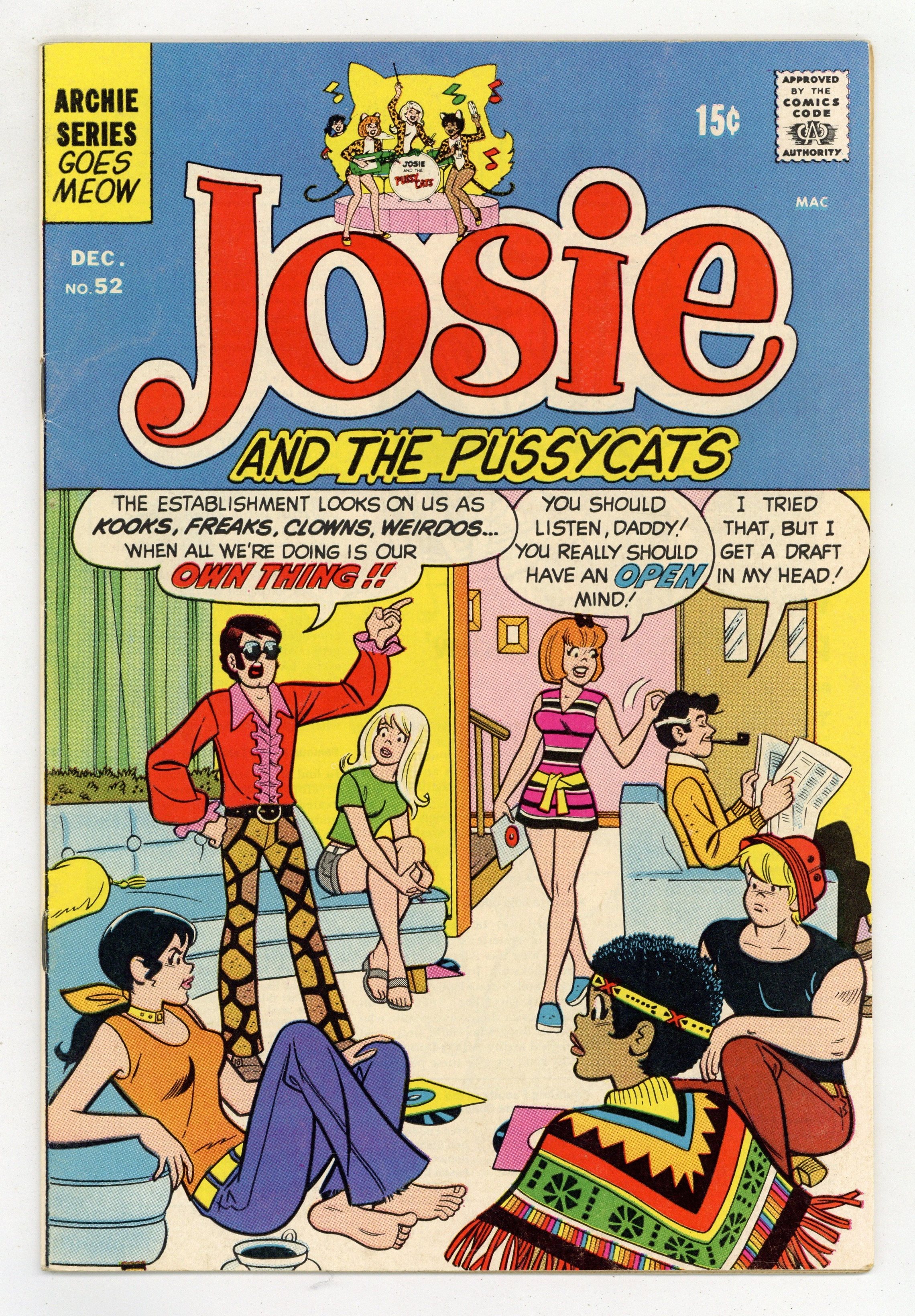 Cover pencils by Dan DeCarlo, inks by Rudy Lapick. Contact; Melody says that Josie and Alex are "stuck on" each other, and she means it literally: she spilled some incredibly adhesive glue on them. Campus Cut Up; The Pussycats visit a university which is falling apart and is about to be condemned by a building inspector. Back To Nature; Alex and Alexandra decide to start a commune, an idea Josie and her friends are enthusiastic about. Scripts by Frank Doyle, pencils by Dan DeCarlo, inks by Rudy Lapick. Alex's Pin Up one-page strip, pencils by Dan DeCarlo, inks by Rudy Lapick. Late Show! humor page with Li'l Jinx by Joe Edwards. 36 pgs. $0.15. Cover price $0.15.
