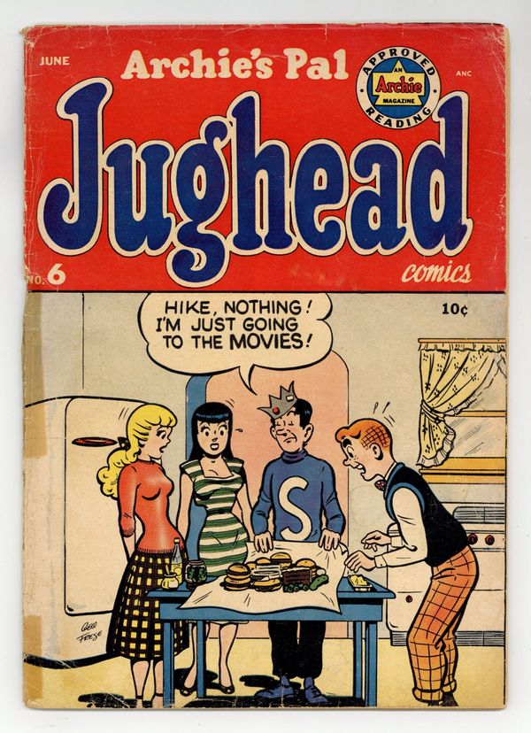 Cover by George Frese. "Super Fizz," art by George Frese; Mr. Weatherbee thinks Jughead has created a new super-explosive but it was only the water main bursting from pressure. "Feast Or Famine," art by George Frese; Reggie bets Jughead that he can't go a week without hamburgers; Jughead forces himself to do so, not knowing that he sleepwalks to the diner and eats hamburgers at night. Jughead Fun Page by Dave Berg. Safety Touch public service announcement; Archie shows Jughead how to avoid accidentally drinking poison out of the medicine cabinet. "Ceiling Zero"; Miss Grundy thinks Martians have invaded, but it's only Jughead making tiny paper airplanes; Mr. Weatherbee discovers another airplane, with a note to meet in the park. "Art Burn," art by Samm Schwartz; Suzie takes Ferdie to a modern art museum; Ferdie decides he could do a sculpture as good as the ones in the museum. 36 pgs., full color. Cover price $0.10.