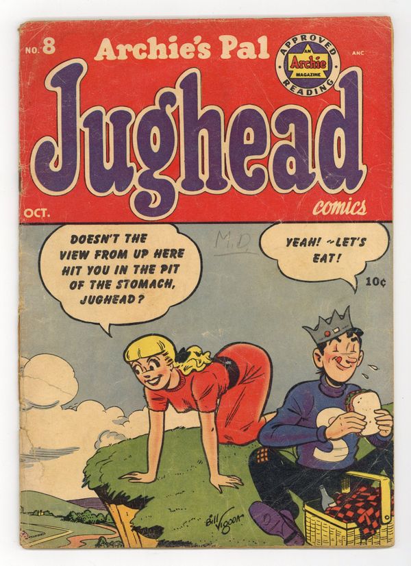 Cover by Bill Vigoda. "Early To Wed," art by George Frese; A remark made in anger by Betty causes Jughead to misinterpret something he sees Veronica and Archie doing and soon both the Andrews and the Lodge families think Veronica and Archie are eloping. "The Apple Of His Eye," pencils by George Frese; Jughead volunteers to play William Tell's son in a school play, with nearsighted Mr. Weatherbee set to play William Tell and intent upon using real arrows. "To Tee Or Not To Tee," art by George Frese; Mr. Lodge is desperate to beat a hated business rival at golf. However, he draws Jughead as a caddy. "Willow The Weeper," art by George Frese; Jughead overhears a conversation his parents are having and thinks they're about to adopt. "Tooth And Wail," art by George Frese; Betty and Jughead team up to try to baby-sit a two year old terror. "It's Loaded," art by Dave Berg; Archie shows Jughead an antique revolver he found in the attic, assuming that it isn't loaded. 36 pgs., full color. Cover price $0.10.
