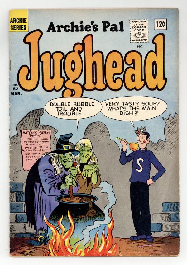 Cover by Samm Schwartz. "Ask a Foolish Question," art by Samm Schwartz; Reggie seems to be the only one who notices Jughead's strange behavior (wearing a wastebasket on his head, walking a bear, riding a unicycle), but when he confronts Jughead about it, the bear confronts Reggie. "Leave and Let Leave," art by Samm Schwartz; Jughead and Archie visit the Old Monsters' Home but the guard tries to keep Jughead. "Dumb Animal," art by Samm Schwartz; Jughead's dog can't hear but he can read lips and read signs, so Archie writes a sign that says "Get Lost." "Monster Mania," pencils by Dan DeCarlo; Everyone goes to the Monster Show to get souvenirs from classic Hollywood monsters. "Prof. Jughead's Educational Corner," art by Samm Schwartz; Jughead educates girls on the proper tactic for convincing boys, not pleading, not nagging, but crying. "Clothes Make the Man," art by Samm Schwartz; Betty and Veronica judge Jughead by his clothes, so Archie decides to dress just like him, but it makes him crave hamburgers. 36 pgs., full color. Cover price $0.12.