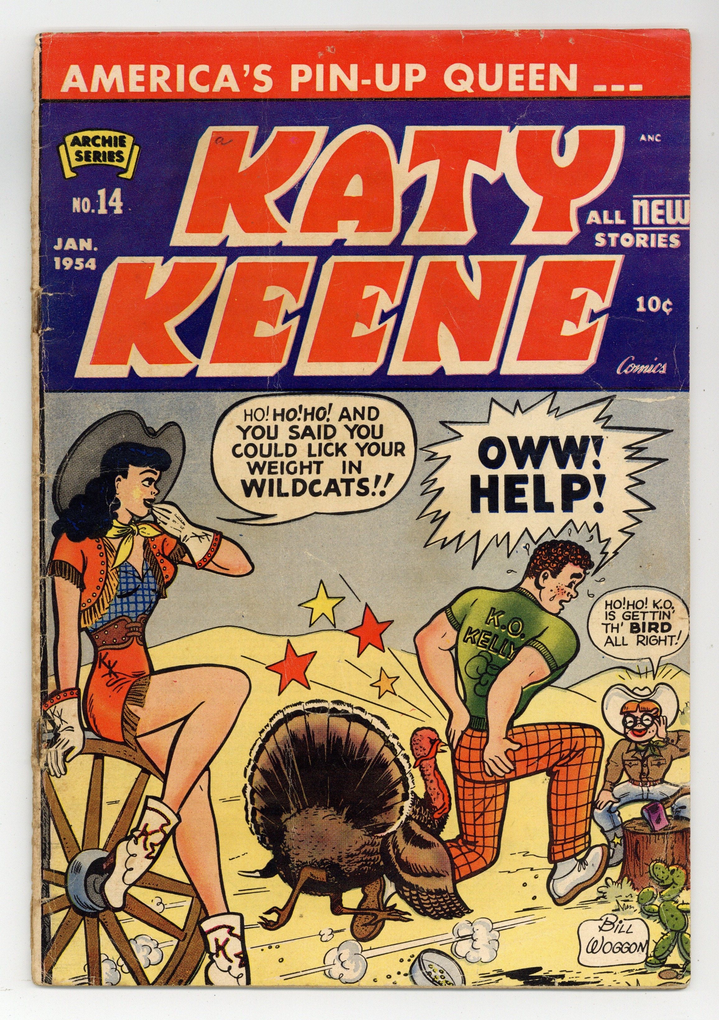 Stories, Art and Cover by Bill Woggon. America's pin-up queen Katy Keene in three untitled stories: Katy gets a part alongside Errol Swoon involving scenes with lions, gorillas, and elephants, but she faints when she sees a mouse in Danny's office; Katy gives in to reader demand and does a story with more pin-ups...when Gloria calls demanding to be included, Katy gives her some less than attractive poses; and a studio photographer sent to take photos of Katy at home accidentally shoots her neighbor Bertha instead. Plus: "Katy Fashions and Puzzles" activity page; Sis the Candy Kid 1-pager "A Short Animal Tale" - Sis draws herself as an octopus with a sweet in each tentacle; "Gloria Fashions" 1-pager; Debby/Taffy story "Strange Things Are Hoppining" - Debby's parents are confused when she plays a game of "Strange Things are Hoppining" on the phone with Betsy; Sis the Candy Kid 1-pager "A Short Pig Tale" - Bill Woggon breaks the fourth wall to teach Sis a lesson about eating too much candy; "Sis Fashions" 1-pager; untitled K.O. Kelly story - Gloria hires Fearless Fagan as a sparring partner for K.O. but fires him when he knocks out K.O.; Betty 1-pager "Framed!" (unknown credits) - Betty defaces a photograph of Archie, mistaking it as a gift he meant for Veronica; "Katy and Bertha Fashions" 1-pager; and 2-page Hollywood Gossip article. 32 pages, full color. Cover price $0.10.
