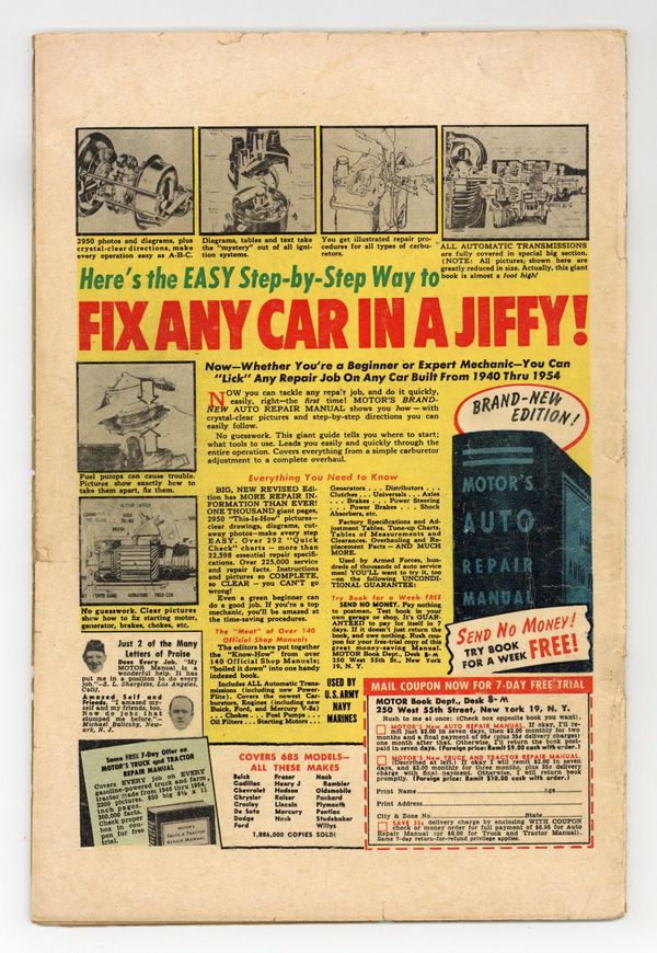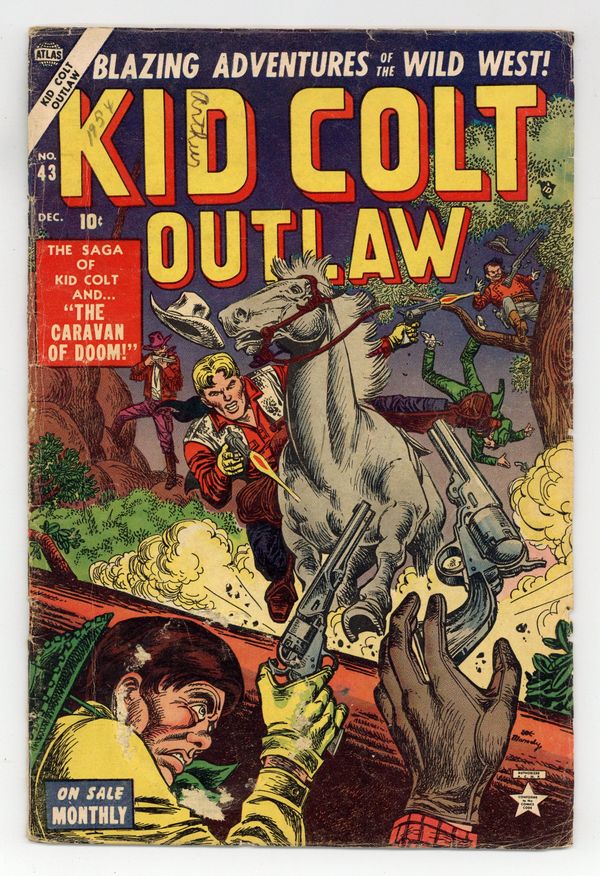 Cover art by Joe Maneely. Untitled story, art by Jack Keller; Having traveled into Mexico, Kid Colt has crossed paths with a Mexican bandit named Sanchez and his gang; While they are trading lead, one of Sanchez's men sneaks up behind him and strikes the outlaw hero over the head with the butt of his rifle; However, Sanchez stops his men short of shooting Kid Colt, deciding it will more fitting to dump out his canteens and leaving the Kid to die of thirst in the desert. Untitled story, art by Jack Keller; Kid Colt awakens and learns that his canteens have been emptied and pushes Steel to try and get to water before they both die in the desert;. He finally reaches his destination, the ranch of his friend Perez. "Branded" text story. "The Meeting," pencils by Syd Shores, inks by Chris Rule; The Black Rider has tracked down an outlaw named Lash Bellows and warns him against causing trouble for Brad Conway in the town of Leadville; When Bellows draws, the Rider shoots the guns out of his hands and sends him packing; The Rider then returns back to town and changes back into his alter ego Dr. Matthew Masters in order to treat Conway for a gunshot wound. Untitled story, art by Jack Keller; Kid Colt is riding along the deserts when he spots a wagon train and decides to go down and say hello to them and see if there is any way he can help them out; Also spotting the homesteaders are a group of Native Americans who also head toward the approaching caravan; The guide for the homesteaders is Mapes who sees the approaching Native Americans as a threat and demands to know what they want. 36 pgs., full color. Cover price $0.10.