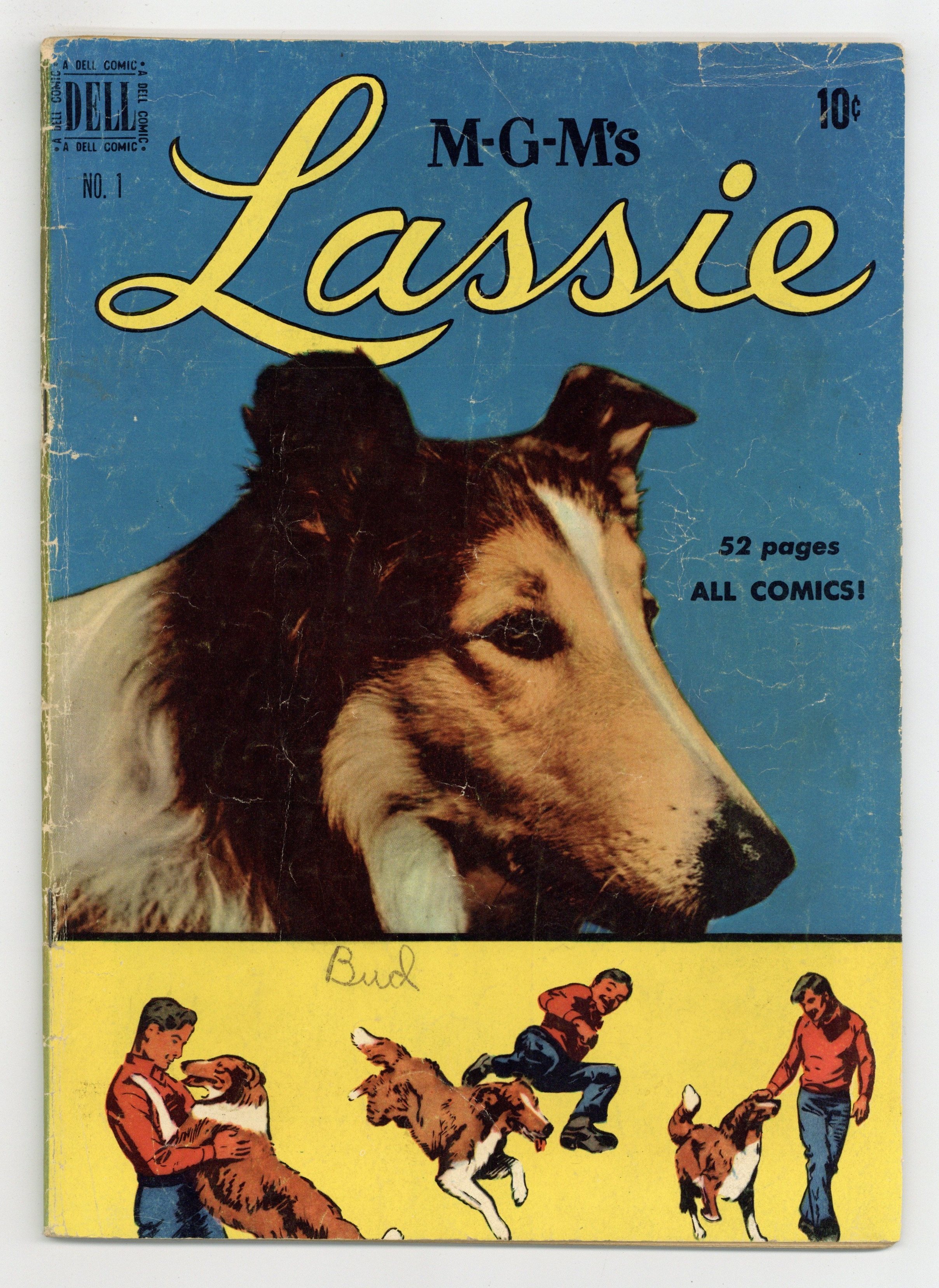 Lassie photo cover, with art by Morris Gollub. Lassie photos inside front cover, inside back cover, back cover. Lassie Finds a Friend, script by Gaylord Du Bois, art by Mo Gollub; Rocky runs away from the orphanage, meets Lassie and, later, Ben, and secures a job with coffee planter Mr. Lawrence. 52 pages, full color. Cover price $0.10.