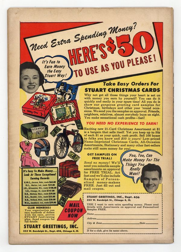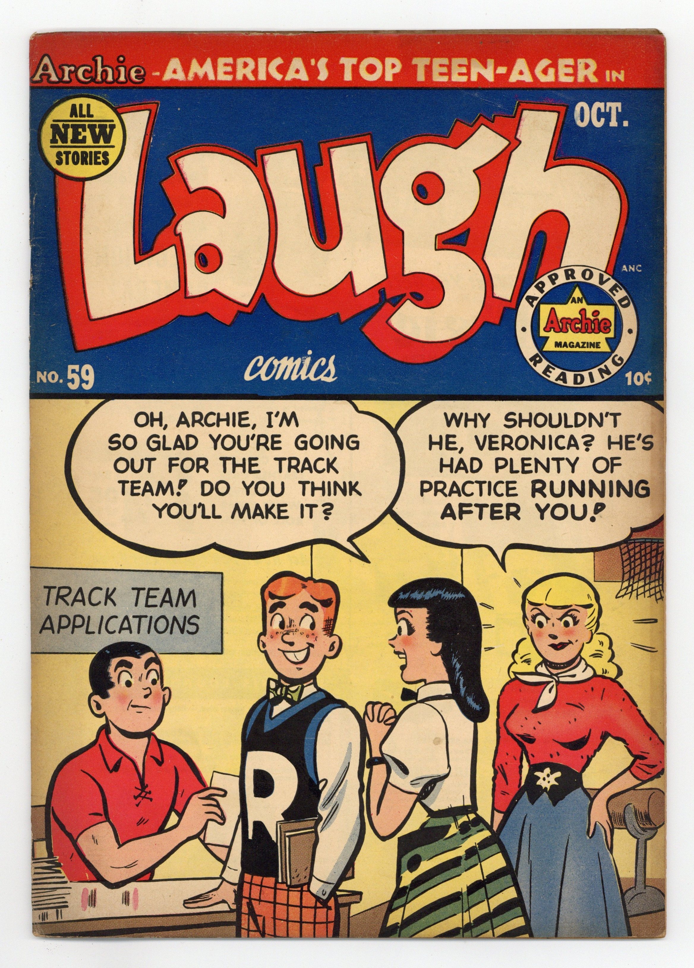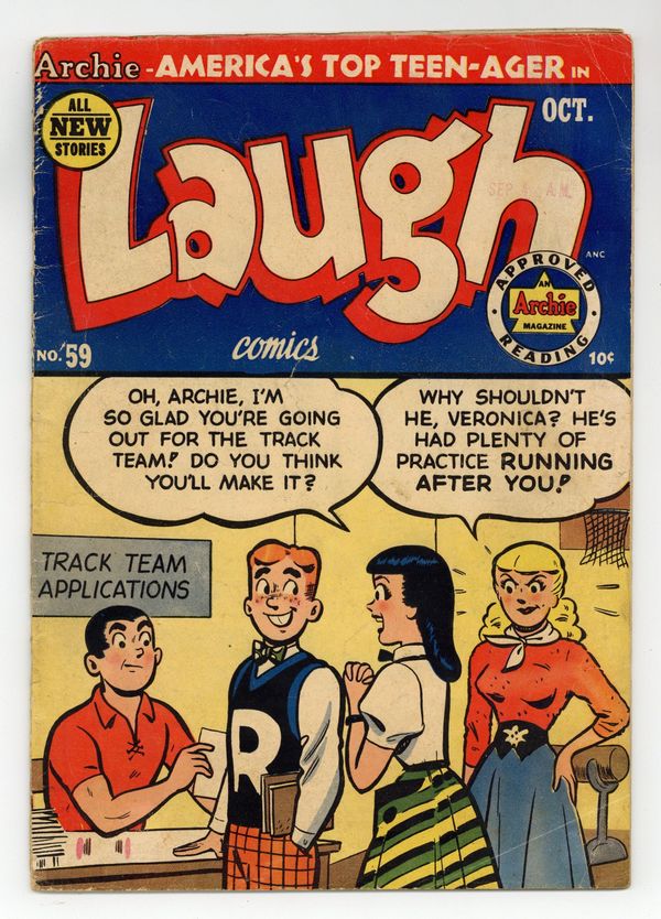 "Term Mights," script by Frank Doyle; At the start of a new school term, Archie and Reggie vow to be model students, right up to the moment they find out there's an empty seat next to Veronica in Algebra class. Untitled story, script by Bill Woggon, pencils by Hazel Marten (as Bill Woggon), inks by Cassie Bill and Floyd Norman (backgrounds); K.O. feels unable to compete with Randy's millions, until Katy asks for something that only he can provide. "Which Is Witch?", art by Joe Edwards; Linda attempts black magic to get Laurie out of the way. "Bottle Baby," script by Frank Doyle, pencils by George Frese; Using clever word play, Jughead cons his way into three ice cream sodas. 36 pgs., full color. Cover price $0.10.
