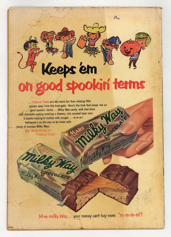Starts Dec 8 "Cheaper By the Cousin"; Archie's hopes of an evening alone with Veronica are hampered by her young cousin. "A Fish in Time"; While the others eagerly anticipate going through the tunnel of love at the amusement park, Jughead would rather go fishing. "Weak-End Trip"; As a joke, the boys intimate they are going to play around on Betty and Veronica once they leave Riverdale for a lakeside vacation. "Number Please," pencils by Samm Schwartz; Suzie tries to call Ferdie, but gets the butcher shop instead. Untitled story, script by Bill Woggon, pencils by Hazel Marten (as Bill Woggon), inks by Cassie Bill; Katy and K.O.'s afternoon of fishing is spoiled by Katy's stalker. Katy's Fashions page, art by Cassie Bill. "Mock Rock," art by Harry Lucey; Veronica mistakes a giant sea turtle for a rock and sets her picnic lunch on its shell. "Wasted Effort," script by Frank Doyle, pencils by Harry Lucey; Ginger tries to help Patsy with her diet. 36 pgs., full color. Cover price $0.10.