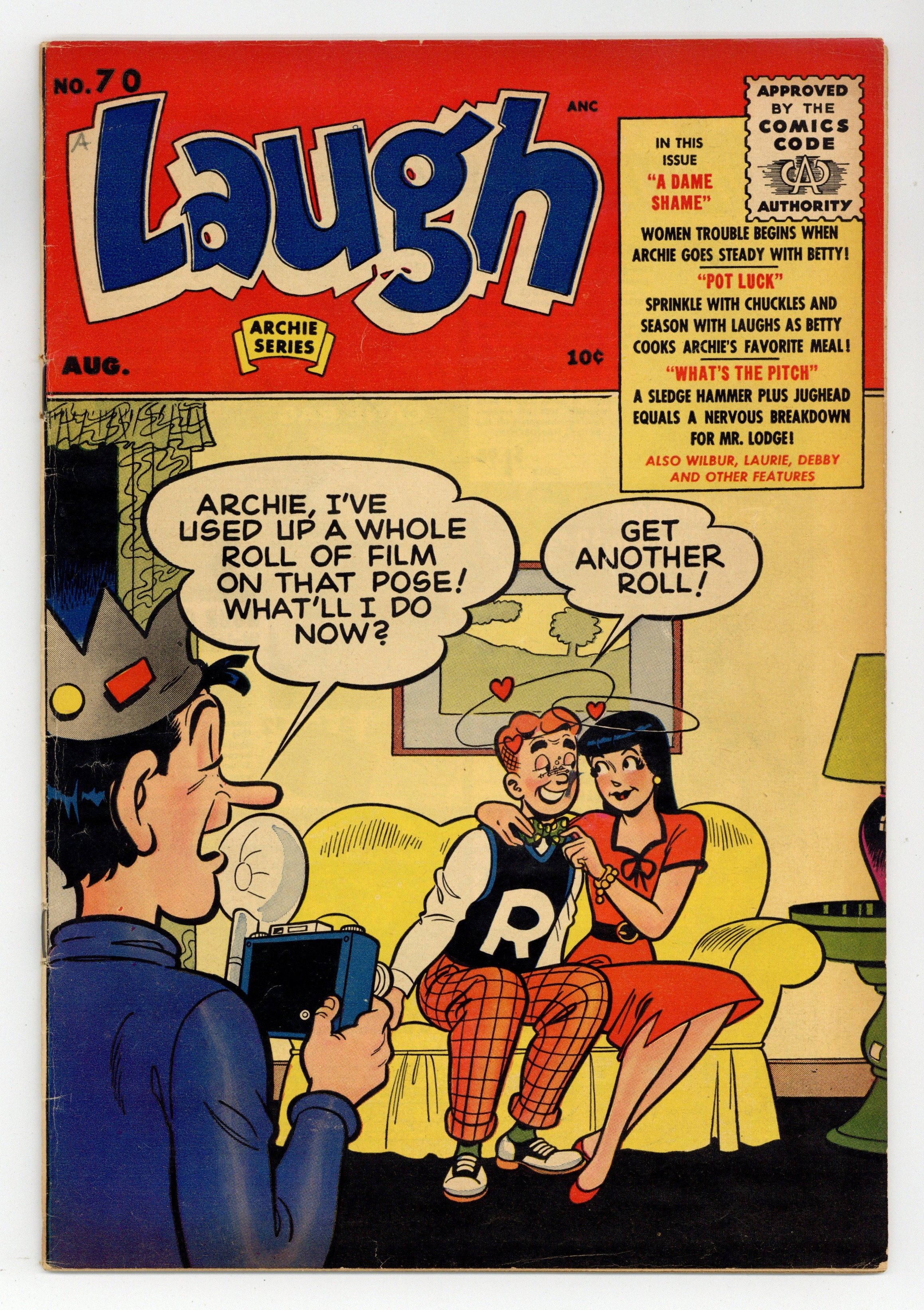 Cover art by Bob Montana. "A Dame Shame," script by Frank Doyle, pencils by George Frese; When Veronica breaks a date with Archie, he decides to dump her for Betty; But Betty doubts his motives. "Tub Flub"; Jughead hears the rush of the ocean. "Study Buddy"; Reggie is trying to study. "Telltale Tall Tales," art by Samm Schwartz; Jughead auditions for the local liar's club. "The Weeper Sex," art by Samm Schwartz; Betty tries to console a crying boy. "Water Wager"; Jughead bets he can consume ten glasses of water in a row. "Ups and Downs"; Moose feels obligated to ride an attraction he hates. "Flicker Snickers"; The gang has a questionable time at the cinema. "Pot Luck," pencils by George Frese; Reggie and Betty conspire to use Betty's cooking to break up Archie and Veronica, but Reggie goes off script. "Laugh It Up" jokes page. "Safe At Home," art by Joe Edwards; A neighbor manages to avoid getting his window broken by Wilbur's batted ball. "He Flipped His Mat," art by Joe Edwards; Mr. Lake drops a hint on Wilbur. "Hands Up," art by Joe Edwards; Wilbur helps Slats make a decision. Untitled Debby's Diary story, art by Bill Woggon; Debbie and her mother agree to babysit two infants, but their constant crying help to ruin her evening. "What's the Pitch?", script by Frank Doyle, art by Harry Lucey; Archie and Jughead decide to set up a horse shoe pitch in the Lodge back yard. "No Plate Like Home," art by Harry Lucey; Coach tries to show Reggie how to properly tag a sliding runner. 36 pgs., full color. Cover price $0.10.