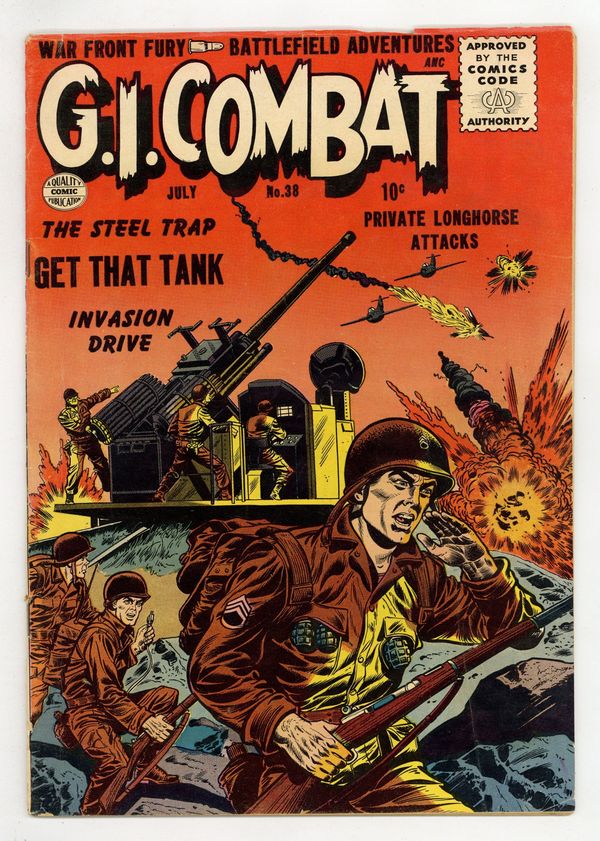 $41.00July 1956: Cover by Dick Dillin and Charles Cuidera; "The Steel Trap," 9 pages; "Get That Tank," 6 pages (reprinted from G.I. Combat #9); "Invasion Drive," 7 pages; "Incident in a Storm," 1 page text story; "Private Longhorse Attacks," 6 pages (reprinted from G.I. Combat #8"). 36 Pages, Full Color. Cover price $0.10.