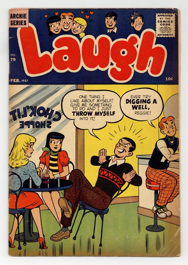 "Up-Set"; Reggie pulls away the ladder from Archie and Jughead while they're fixing the TV antenna for Veronica. "Nothing to Sneeze At"; Mr. Lodge's prize flower causes Archie to sneeze. "Struck Out"; Veronica sets Reggie up on a blind date. "A Few Arrangements"; Laurie seems like she's getting ready to host a party but is just getting ready for Wilbur to come over and help her study. Katy Keene Star Fashions (two pages of art). "The Horrible Truth"; Archie and Reggie criticize Betty and Veronica for exaggerating. "Tasty Examination"; Pat the Brat plays doctor. "Service with a Smile"; Pat the Brat eats all of the ice cream sundaes. Archie Club News. "In a Lather," script by Joe Edwards, pencils by Joe Edwards; Hap carves up soap for a contest and Jinx uses it to wash her hands. 36 pgs., full color. Cover price $0.10.