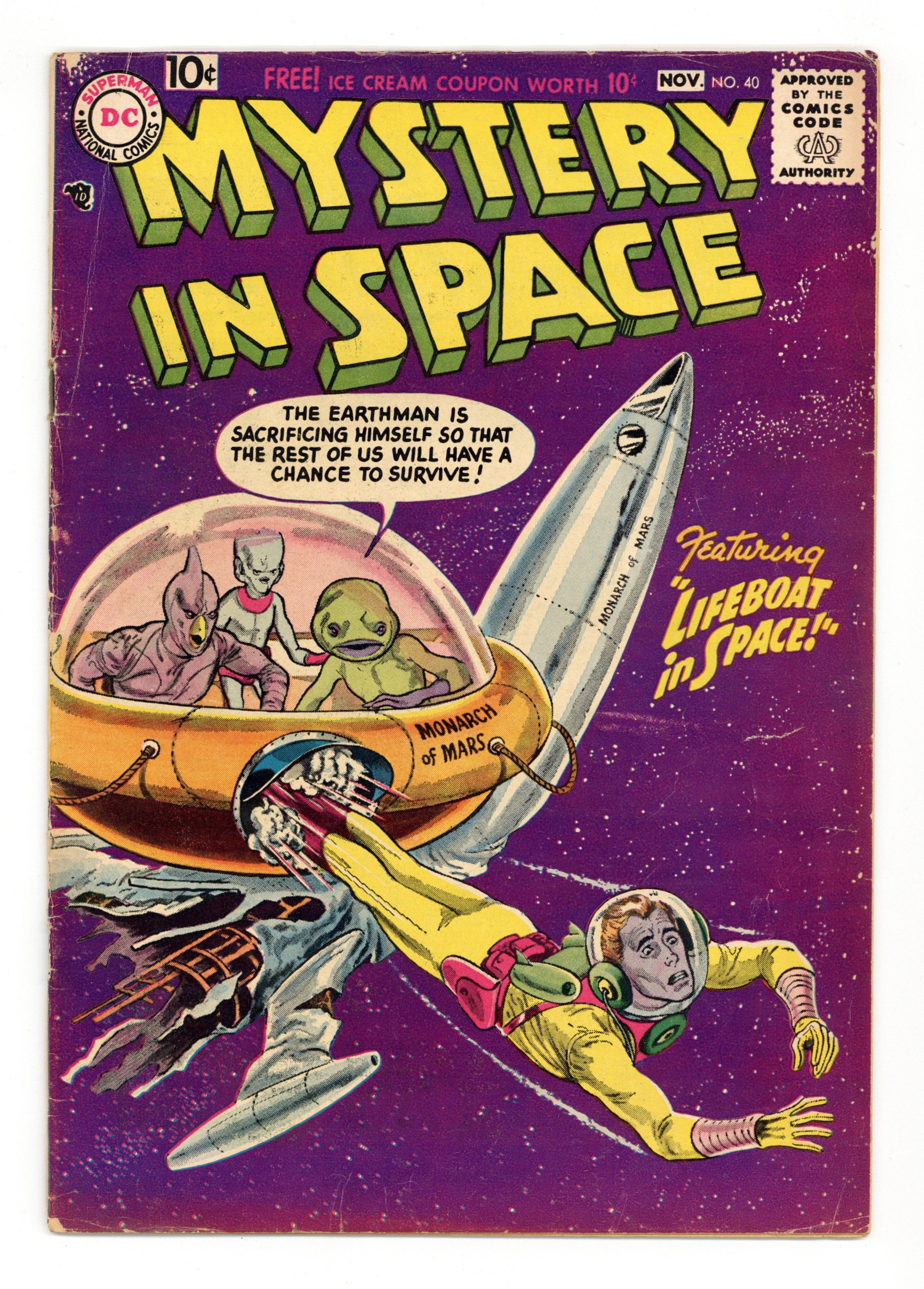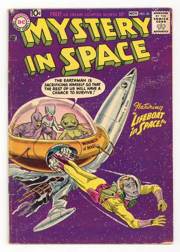 $50.00"Riddle of the Runaway Earth!"; "Secret of the Star Warriors!"; "Interplanetary Speedway!" (pencils by Gil Kane); and "Lifeboat in Space!" Carmine Infantino art? Gil Kane grey-tone cover. 36 Pages, Full Color. Cover price $0.10.