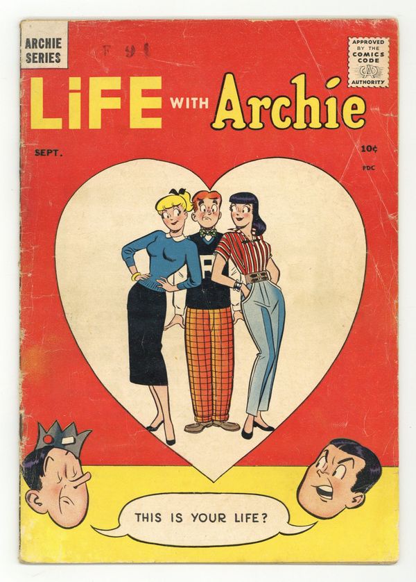 Cover pencils by Harry Lucey, inks by Terry Szenics. Life With Archie, script by Sy Reit, pencils by Harry Lucey, Samm Schwartz, and Bob White; A day in the life of Archie and the gang, which includes a field trip to the United Nations. The pilot issue for the series. While less adventure-oriented than the title eventually became, it introduced the idea of doing longer-than-usual Archie stories, and the U.N. trip provided the basis for the many stories where the gang takes a trip to some real location. The issue is divided into the following chapters: "Rise and Shine," "Please Be Seated," "Mummy Knows Best," "Water Boy," "U.N. Antics," "By Hook Or Cook," "And So To Bed." Cover price $0.10.
