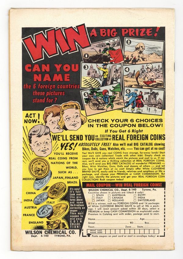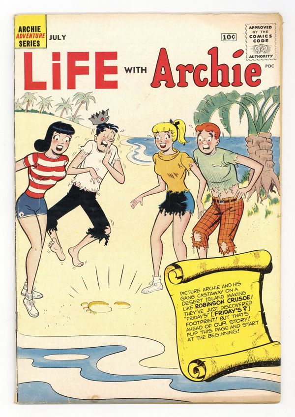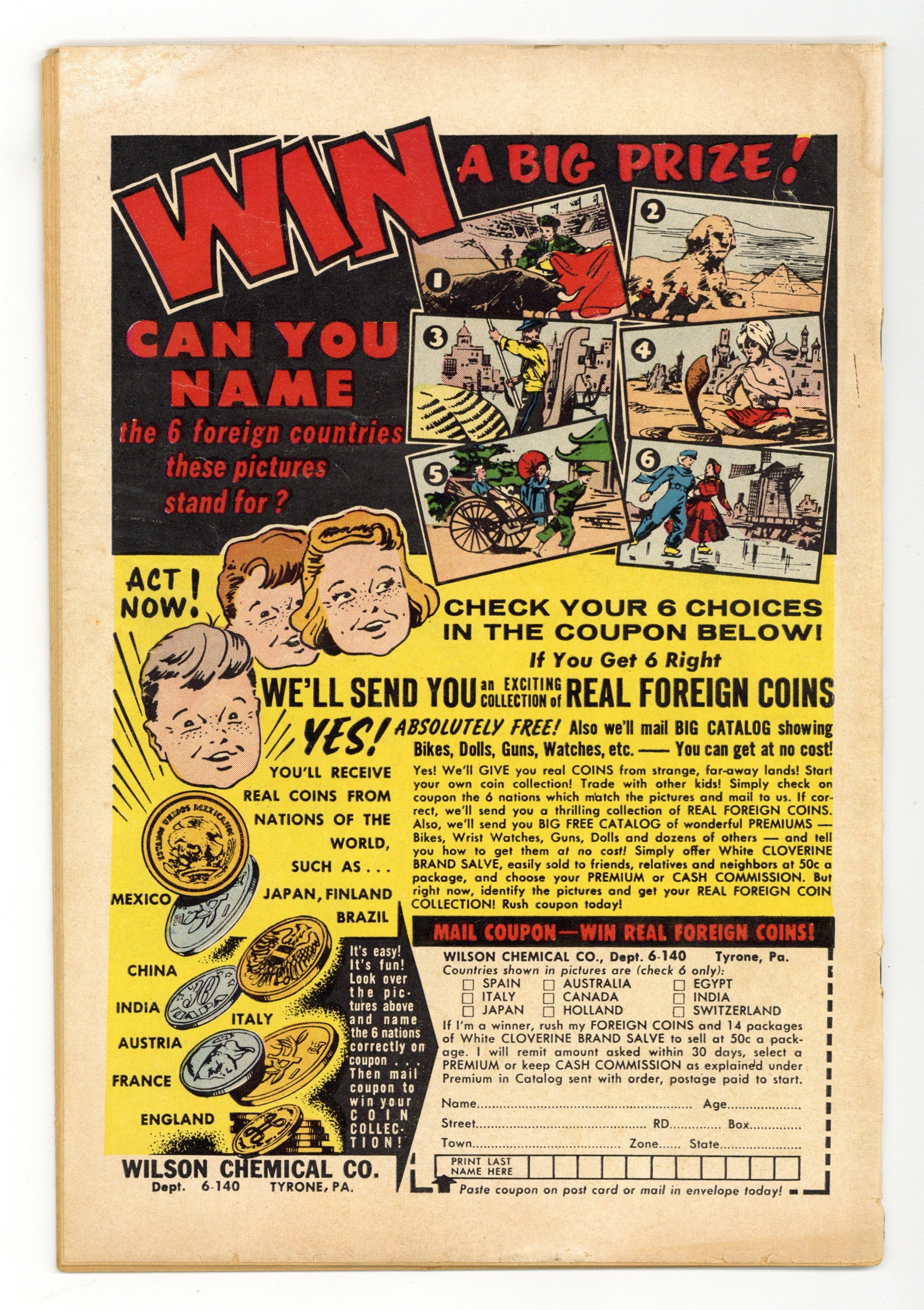 Cover art by Bob White. Adventure, Ahoy!, script by Sy Reit, art by Bob White; Archie and the gang go for a cruise on Mr. Lodge's yacht; Caught in a hurricane, they are forced to abandon ship and wind up stranded on a desert island. Barracuda Terror Of Deep text article. Part-Time Help! starring Li'l Jinx humor page by Joe Edwards. 36 pgs. $0.10. Cover price $0.10.