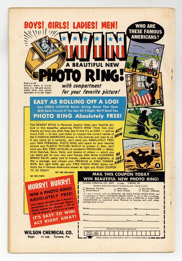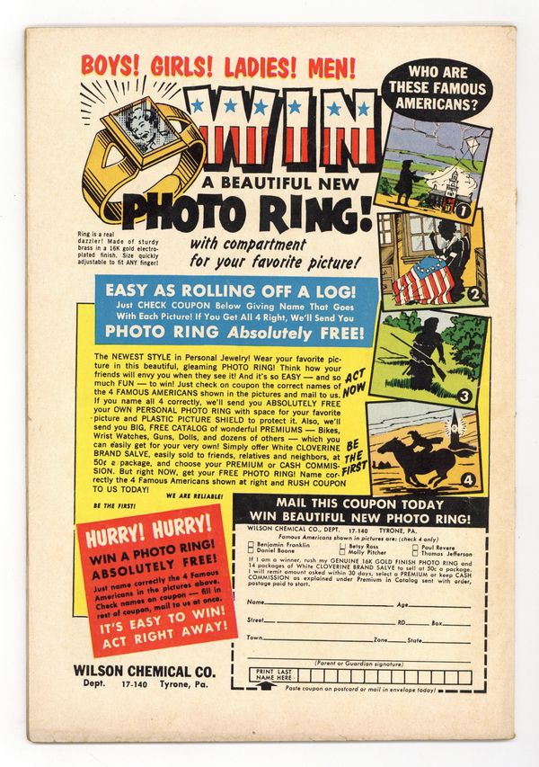 Cover art by Bob White. Book-length story in four chapters: "Robby the Robot," "Robby Joins the Gang," "Trapped in the Ravine!," and "Robby to the Rescue!", script by Sy Reit, art by Bob White; Dilton unveils his greatest invention to date: Robby, a huge metal robot who can do anything, including communicate by beeping once for "yes" and twice for "no"; But when Reggie loses Robby's control mechanism, the robot is free to do what he wants--and what he wants is to act like a typical teen-ager. Bowling text article. Surprise Wise! one-pager starring Li'l Jinx, script and art by Joe Edwards. 36 pgs. $0.10. Cover price $0.10.