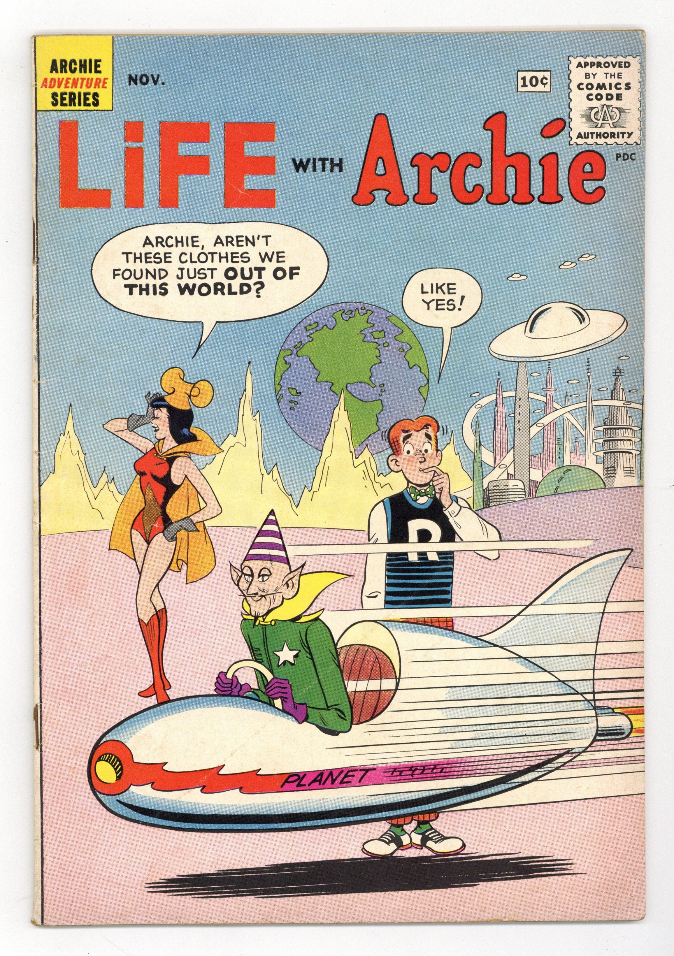 Last 10-cent cover price issue. Cover art by Bob White. Book-length story in four chapters: "The Invaders," "Universal Language," "Out of This World!," and "Bongo's in the Blue!", script by Sy Reit, pencils by Bob White, inks by Marty Epp; Aliens from the planet Virus come to earth to investigate in preparation for a possible invasion; Mistakenly getting the impression that teenagers are the leaders of the planet, they abduct Archie and his friends, who manage to infect the teenagers of Virus with habits like teen slang and rock n' roll. Summer Stock text article, art by Ken Hultgren. The Missing Link one-pager starring Shrimpy, script and art by Joe Harold. 36 pgs. $0.10. Cover price $0.10.