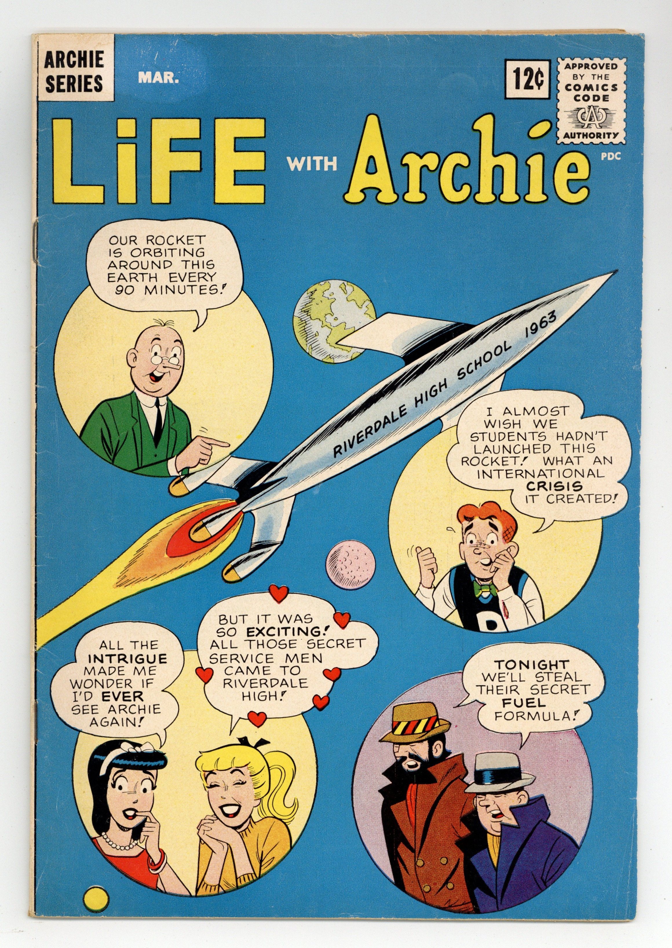 Cover art by Bob White. Book-length story in four chapters: "Rockets Away," "Enter Gussie," "The Search Begins" and "A Slap-Happy Ending," script by Sy Reit, art by Bob White; When Dilton creates a special fuel for the school rocket, Jughead adds some random chemicals to it, and the new formula causes the rocket to literally go into orbit; Dilton and Jughead work to find out what he added to the formula, and when they write down the secret ingredients, they're confronted by international spies who want to steal this amazing new rocket fuel; To keep the spies from getting it, Jughead throws the formula out the window and it's eaten by the school mascot, Gussie the Goat, who is promptly kidnapped by the spies and taken to their hideout; It's up to Archie, Jughead and Dilton to save Gussie and the formula. Dues n' Don'ts one-pager starring Li'l Jinx, script and art by Joe Edwards. 36 pgs. $0.12. Cover price $0.12.