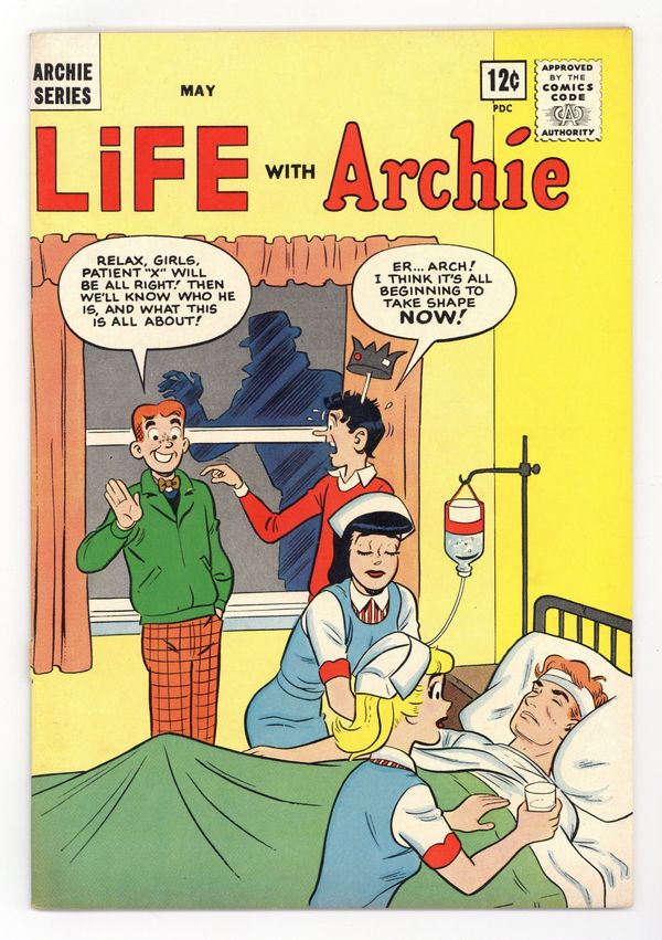 Cover art by Bob White. The Strange Case of Patient X, script by Sy Reit, art by Bob White; Betty and Veronica become nurse's aides at the hospital, where one of the new patients is a comatose man known only as "Patient X"; Betty notices a mysterious man with a red mustache peeking into "Patient X"'s room; When "Patient X" starts to come out of his coma, his only words are "Must protect Carezzo"; Archie and the gang take it upon themselves to solve the mystery of who "Patient X" is, what he's trying to protect, and what the man with the red mustache has to do with all this. E-Motion Pictures one-pager starring Li'l Jinx, script and art by Joe Edwards. 36 pgs. $0.12. Cover price $0.12.