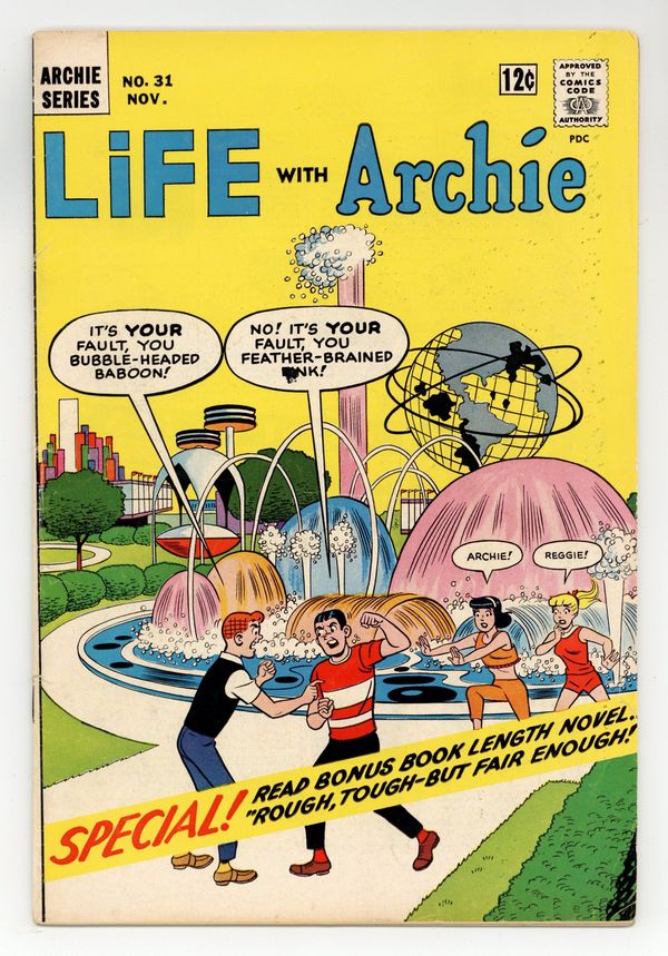 Tags: ArchiePublished Nov 1964 by Archie Publications.$69.00Cover art by Bob White. Book-length story in four chapters: "Symbol Simon," "Fair Enough," "Midway Madness" and "Guided Guys," pencils by Bob White, inks by Marty Epp; After the gang wins a trip to the 1964 World's Fair, the boys have to save Betty and Veronica when they're in an out-of-control cab with an insane driver. 36 pgs. $0.12. Cover price $0.12.