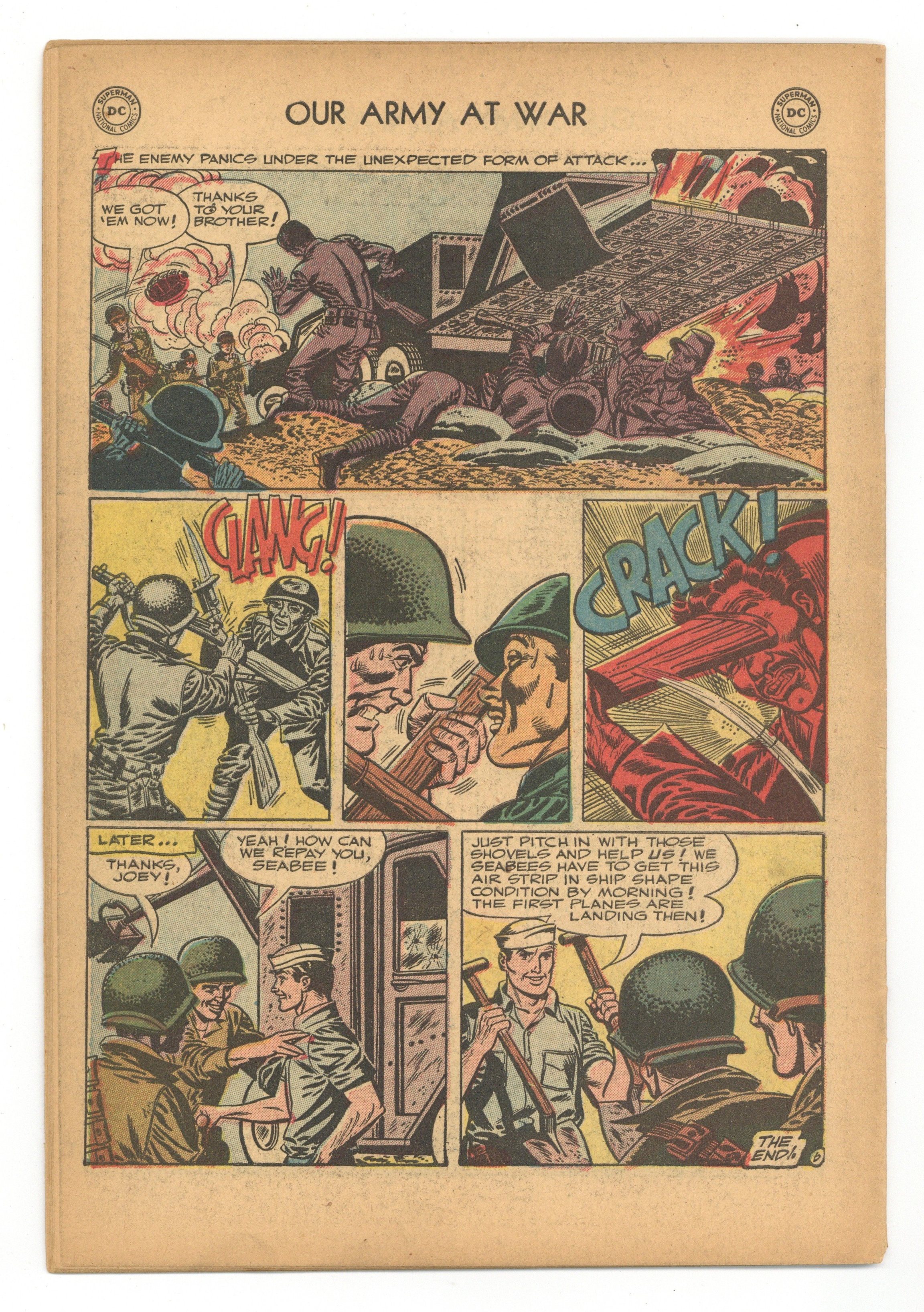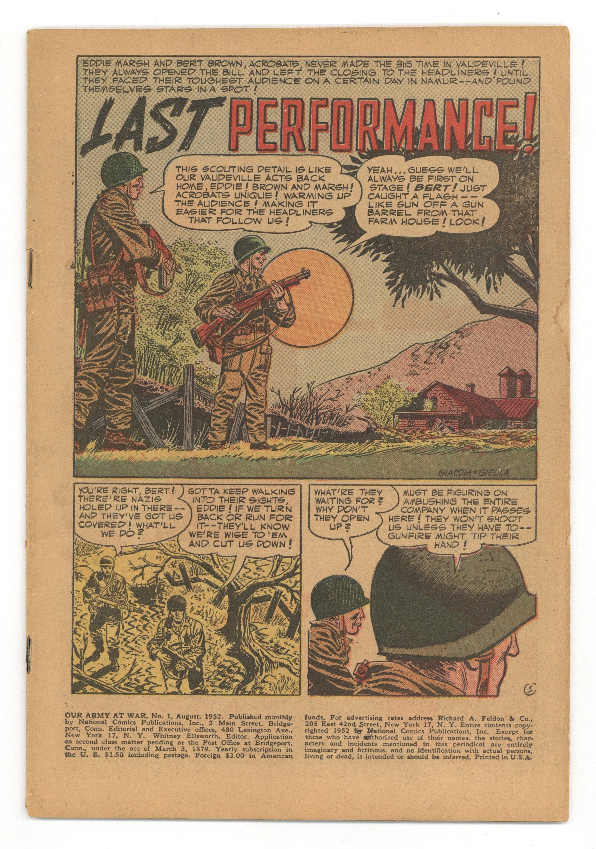 Cover art by Carmine Infantino and Joe Giella. "Last Performance," script by Dave Wood, pencils by Frank Giacoi, inks by Joe Giella; A duo of acrobats, Eddie and Bert, take down punch of nazis who have holed up in a old farm house with their vaudeville routine - and some grenades. Private Diary humor page, art by Irwin Hansen. "Dig Your Foxhole Deep," script by Bob Kanigher, pencils by Irv Novick, inks by Bernard Sachs; nighttime trench warfare in the pacific. "Radar Feet," script by David Kahn, pencils by Irwin Hasen, inks by Bob Lander; an American patrol escapes a superior enemy force in North Africa. "SOS Seabees," script by Dave Wood, pencils by Gil Kane, inks by Joe Giella; a tale about two brothers on the same island in the Pacific, one is a Marine and the other is a sailor. 36 Pages, Full Color. Cover price $0.10.