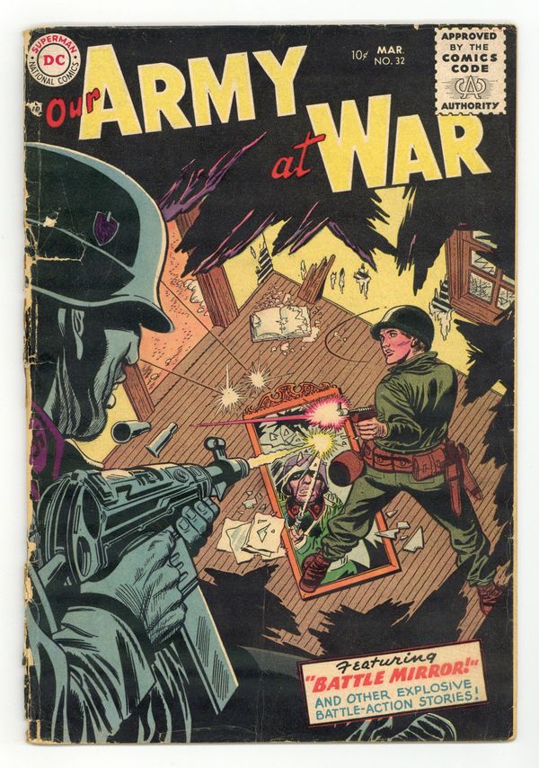 Cover art by Jerry Grandenetti. Battle Mirror, script by Bob Kanigher, art by Jerry Grandenetti. Glory Dive, script by Ed (France) Herron, art by Joe Kubert. Feathered Fighter, script by Ed (France) Herron, art by Arthur Peddy. Sea Soldier, script by Bob Kanigher (as Causin), pencils by Ross Andru, inks by Mike Esposito. 36 Pages, Full Color. Cover price $0.10.