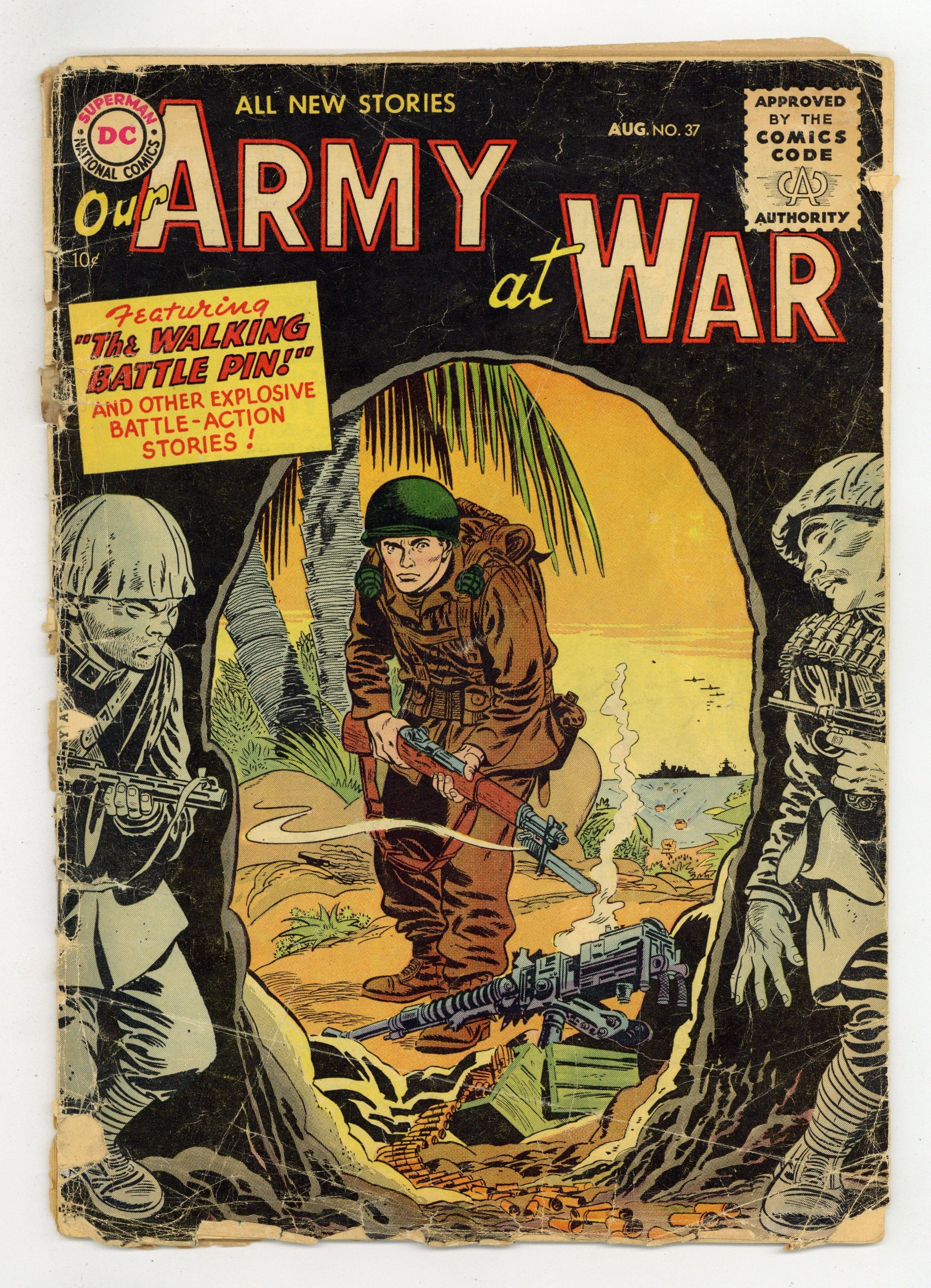 Cover art by Jerry Grandenetti. Walking Battle Pin, script by Bob Kanigher, pencils by Ross Andru, inks by Mike Esposito. Book Sergeant, script by Ed (France) Herron, pencils by Howard Sherman, inks by Robert Stuart. Flivver Fighter, script by Bob Kanigher (as Causin), art by Mort Drucker. Foxhole In The Sky, script by Bob Kanigher (as Causin), pencils by Ross Andru, inks by Mike Esposito. 36 Pages, Full Color. Cover price $0.10.