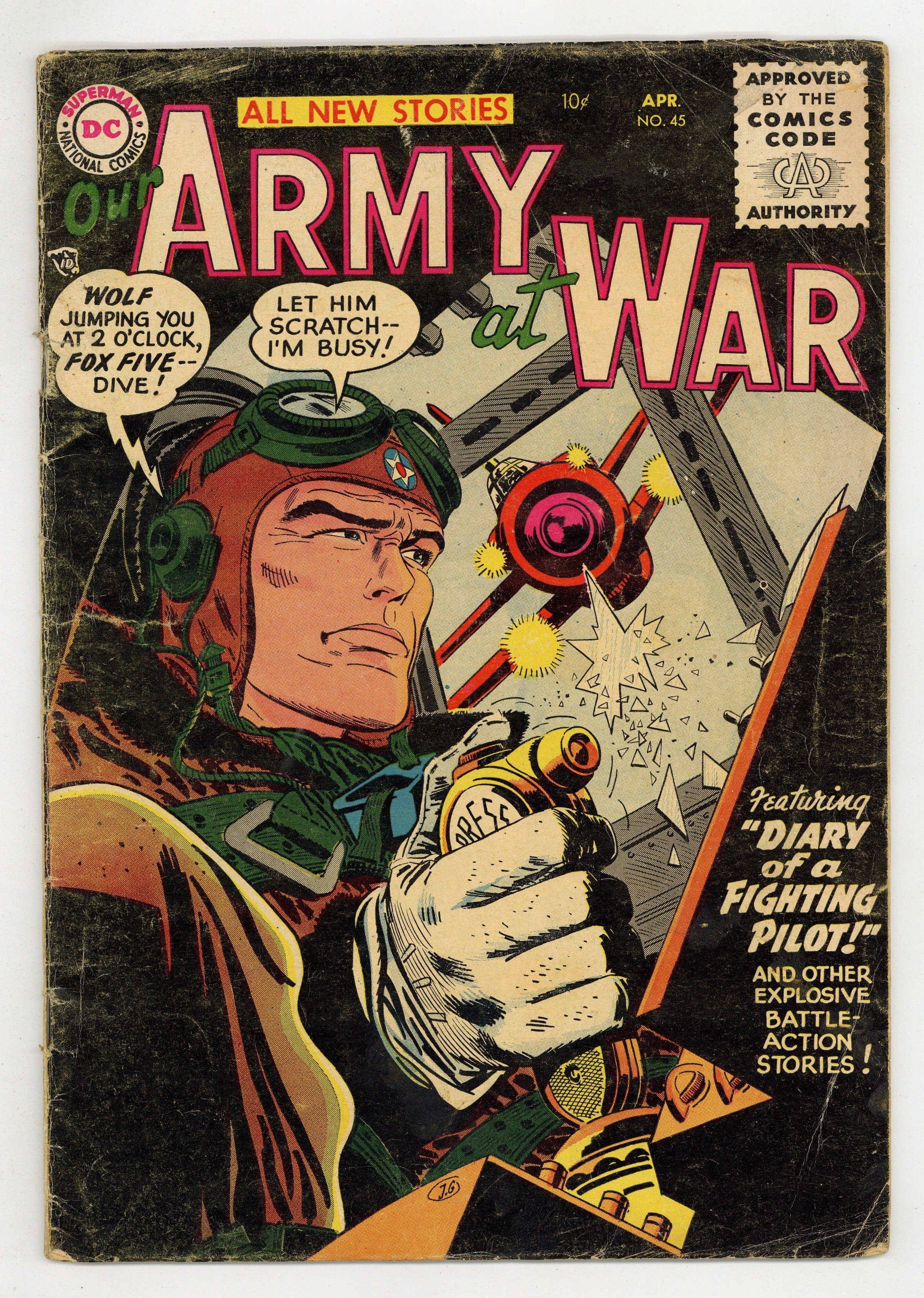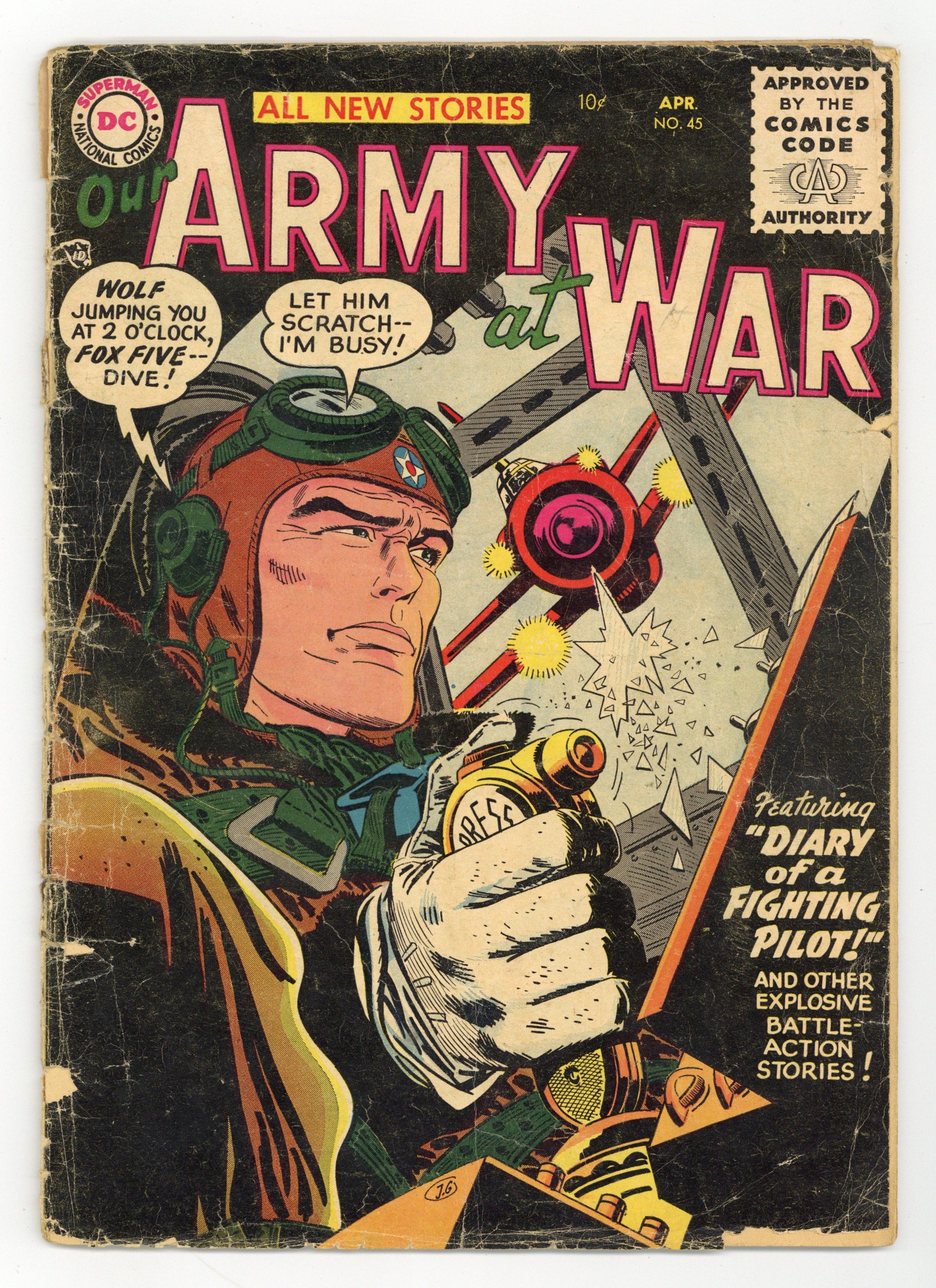 Cover art by Jerry Grandenetti. Diary of a Fighter Pilot, script by Robert Kanigher, art by Irv Novick. Frogman Battle Album, script by Jack Miller, art by Arthur Peddy. G.I. Without A Gun, script by Dave Wood, pencils by Ross Andru, inks by Mike Esposito. Shortcut—War, script by Bob Haney, pencils by Bob Forgione, inks by Jack Abel. 36 Pages, Full Color. Cover price $0.10.