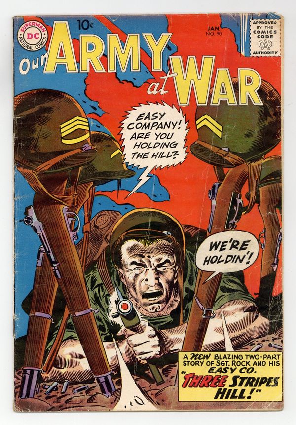 Cover art by Joe Kubert. 3 Stripes Hill! starring Sgt. Rock, script by Bob Kanigher, art by Joe Kubert. A Jet Called Ace, script by Hank Chapman, art by Jerry Grandenetti. Rearguard, script by Bob Haney, pencils by Bob Forgione, inks by Jack Abel. 36 Pages, Full Color. Cover price $0.10.