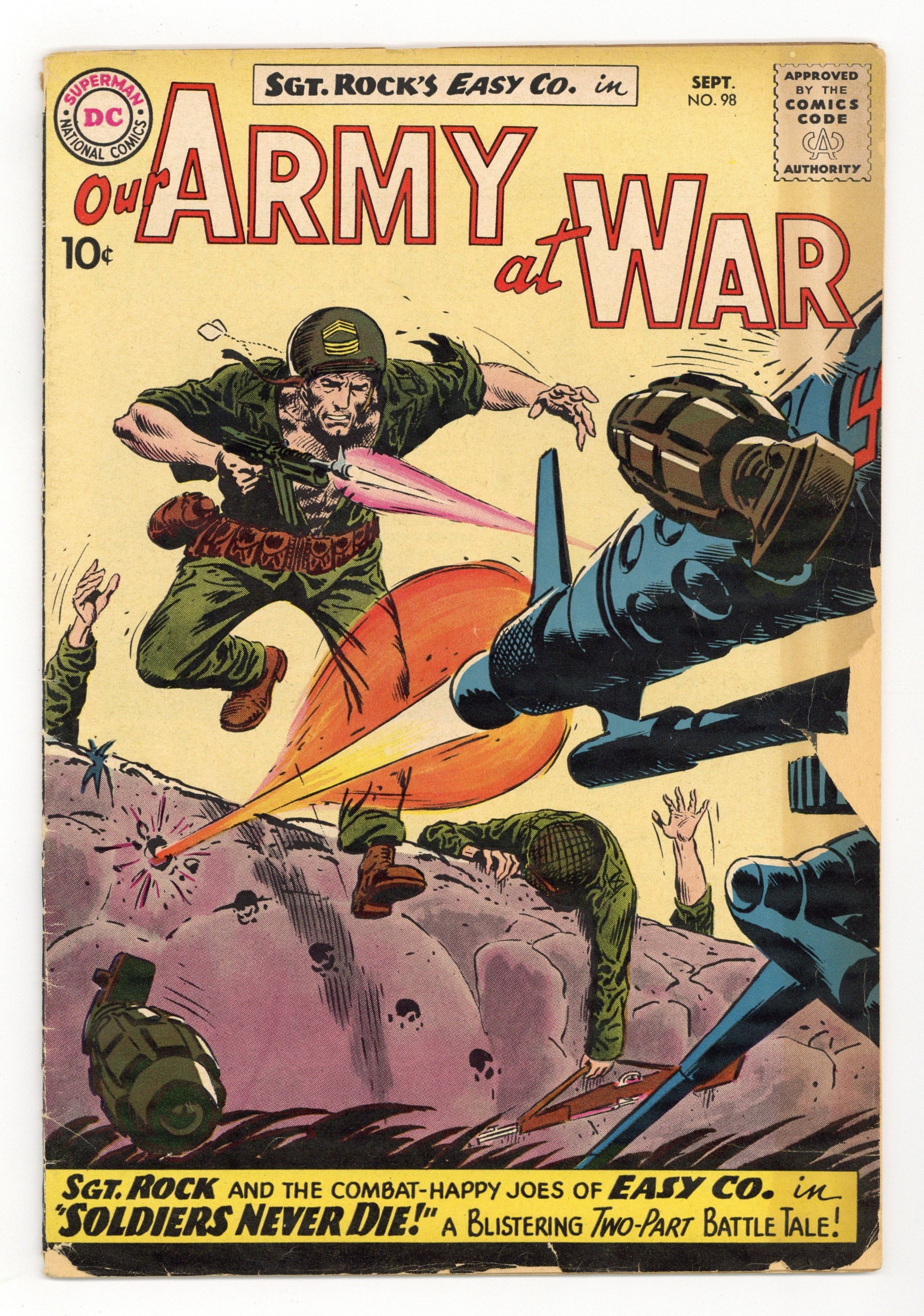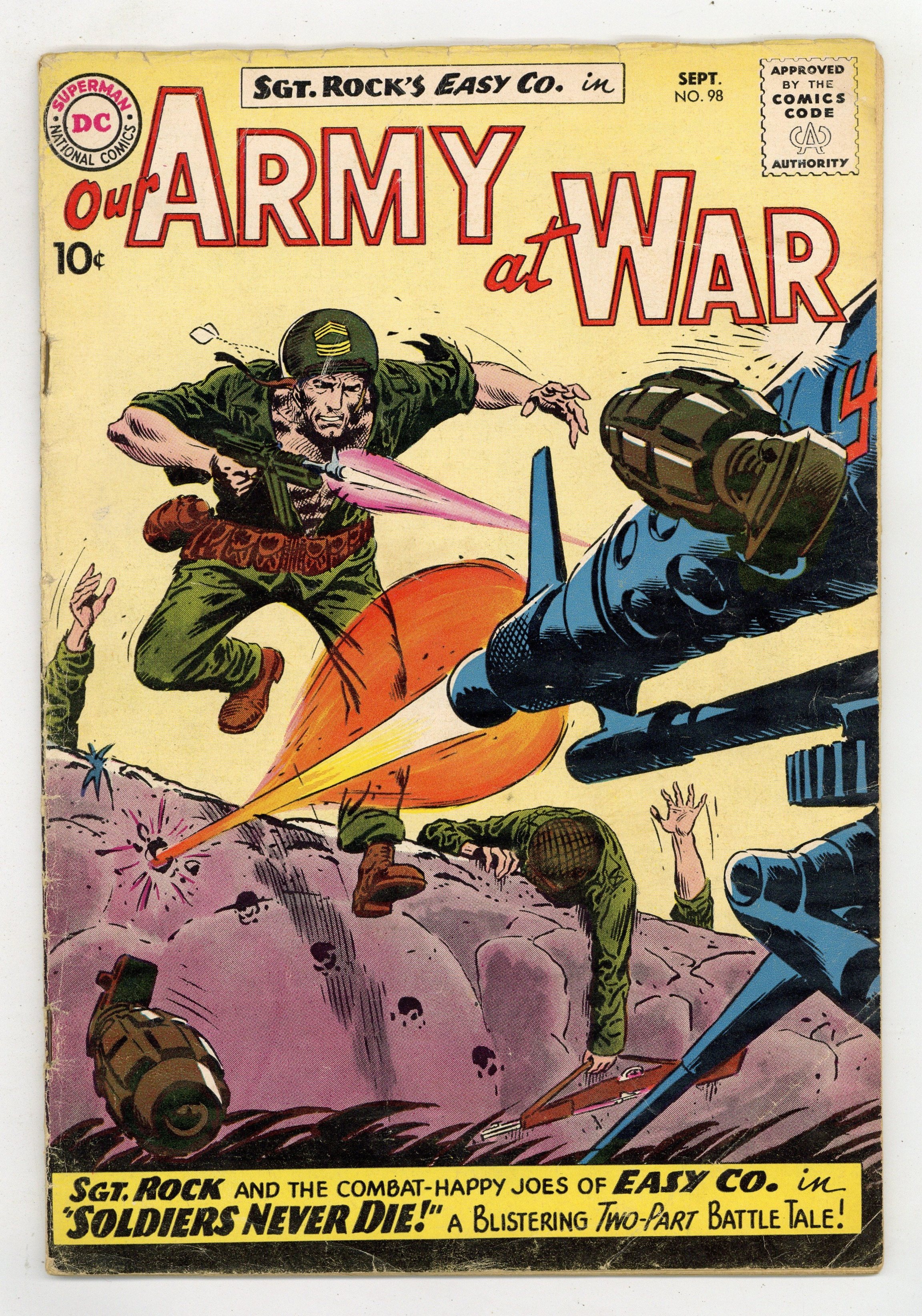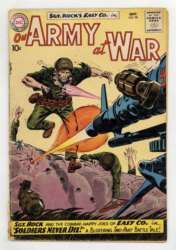 Cover art by Joe Kubert. Soldiers Never Die starring Sgt. Rock, script by Bob Kanigher, art by Joe Kubert. Last Bell For A Jet, script by Bob Haney, pencils by Ross Andru, art by Mike Esposito. A Patrol Lasts Forever, script by Hank Chapman, art by Jack Abel. 36 Pages, Full Color. Cover price $0.10.