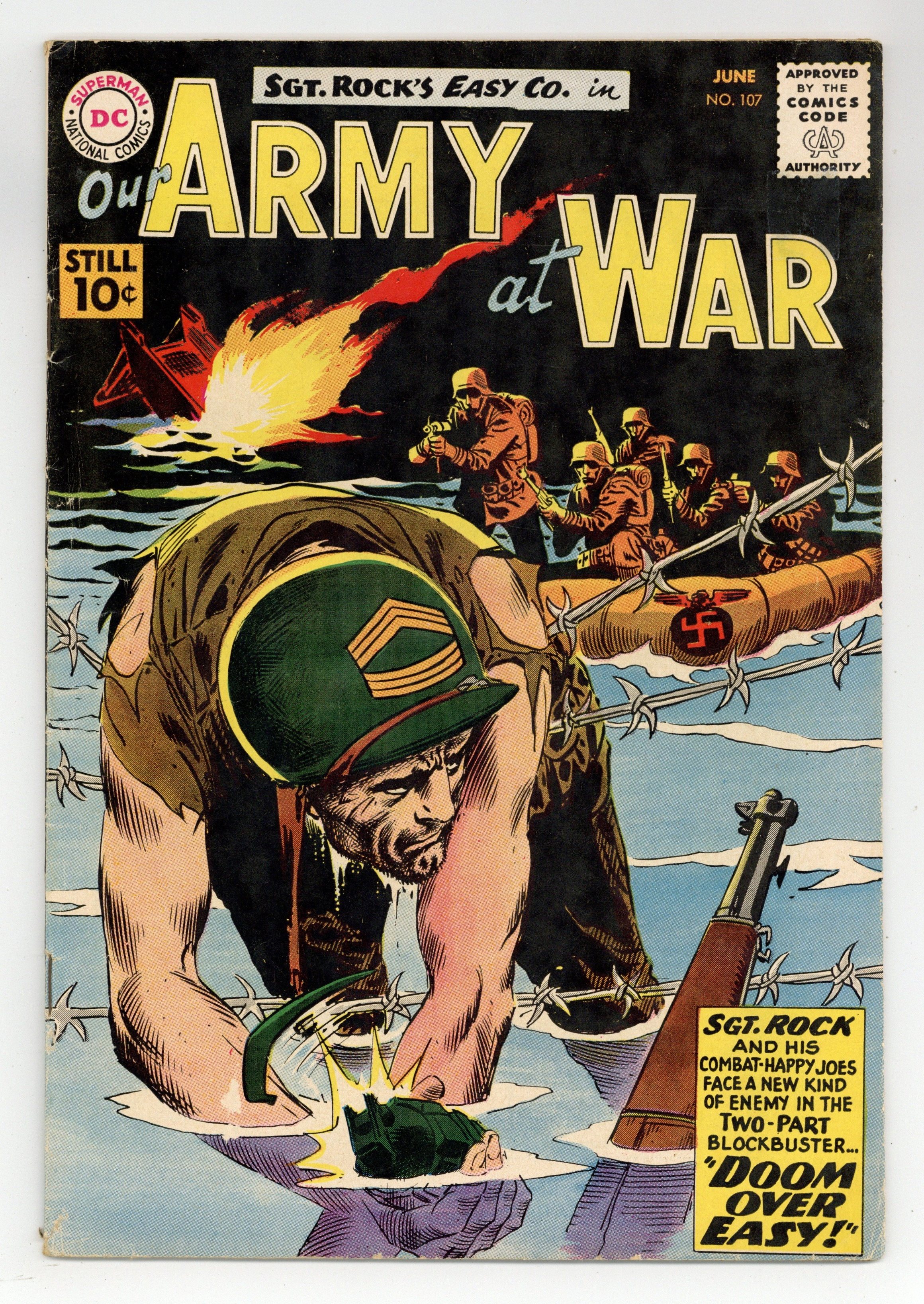 $59.00Cover art by Jerry Grandenetti. Doom Over Easy starring Sgt Rock, script by Bob Kanigher, art by Joe Kubert. The Sixty-Second Ace, script by Bob Haney, art by Jack Abel. Underwater Cowboy, script by Hank Chapman, art by Jack Abel. 36 Pages, Full Color. Cover price $0.10.